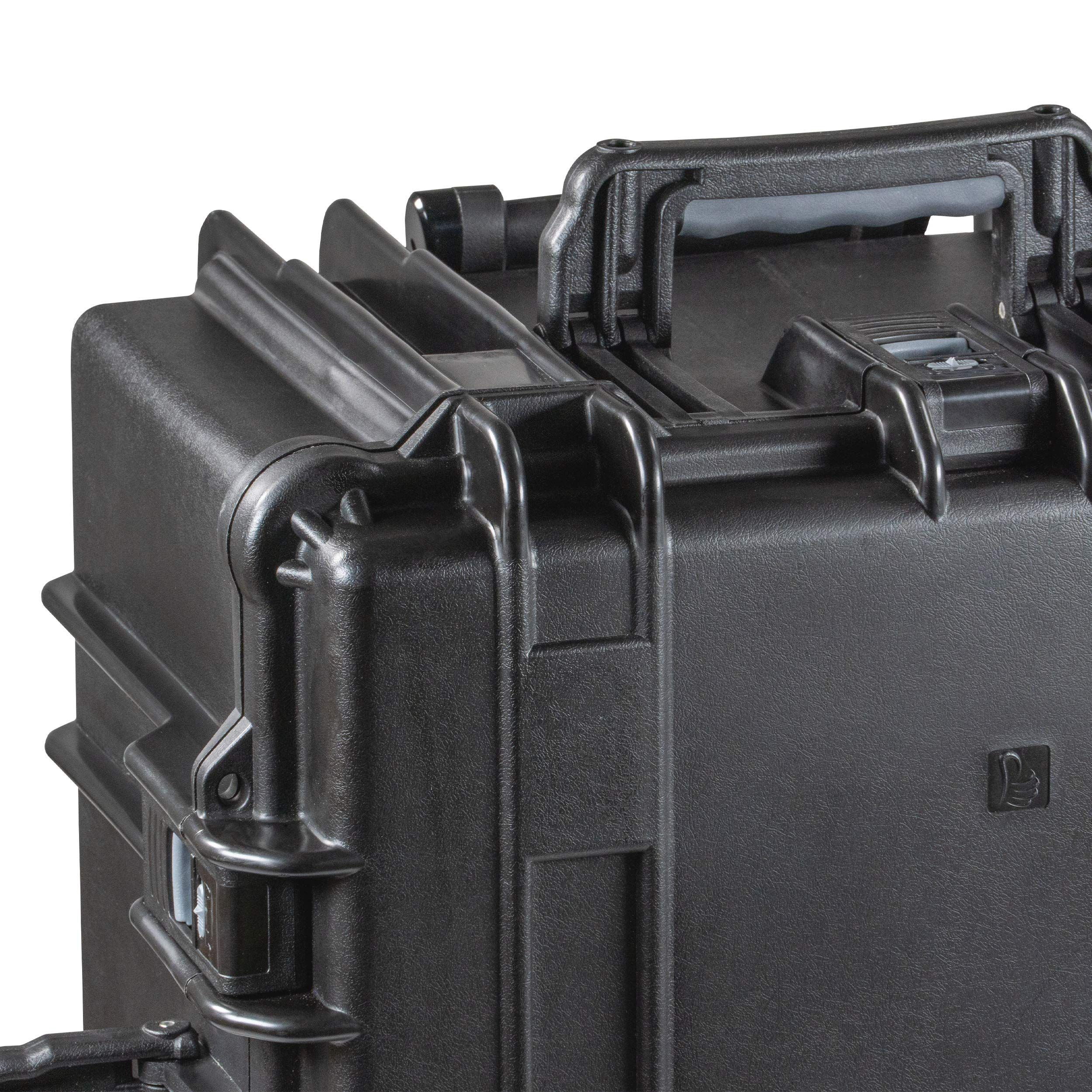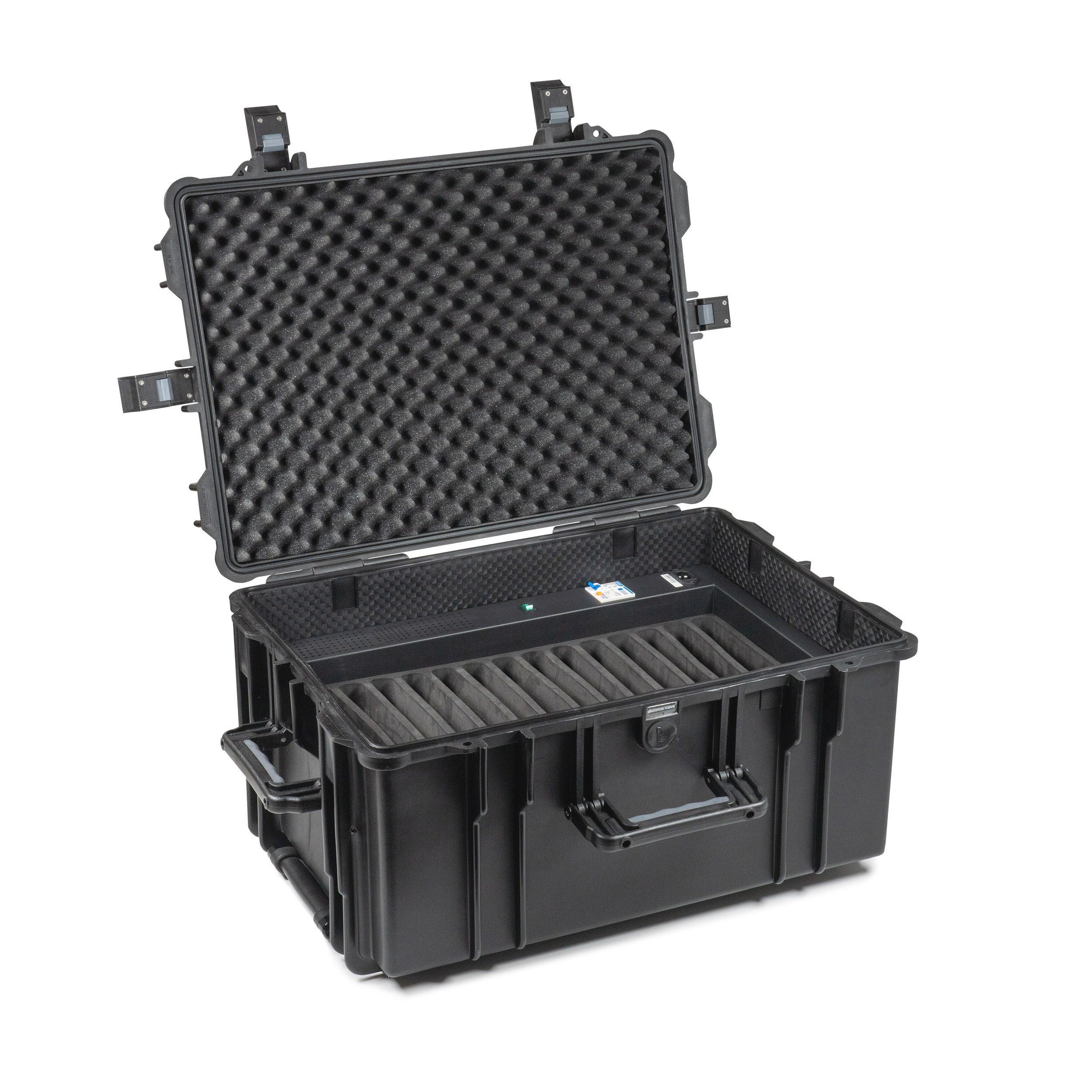 Připraveno k nabíjení během okamžiku: otevřete vozík, zapojte napájecí kabel do zdi, připojte odpovídající kabel USB ke svým zařízením – hotovo. Dodávané kabely USB-C poskytují flexibilitu a šikmé zástrčky zabraňují změti kabelů. LED indikátory vedle portů USB ukazují stav nabíjení: zelená: nabíjení dokončeno, červená: probíhá nabíjení. Pro ochranu vnitřního napájecího zdroje před přehřátím je vozík vybaven výkonným a tichým ventilátorem. Vozík je vodotěsný a prachotěsný podle IP67 a má robustní, odolné pouzdro z ABS se čtyřmi uzamykatelnými západkami pro maximální ochranu zařízení. Odolná kolečka a výsuvná teleskopická rukojeť usnadňují přesun mezi stanovišti. Pěnové polstrování na vnitřní straně také chrání tablety před poškrábáním a poškozením nárazem.
