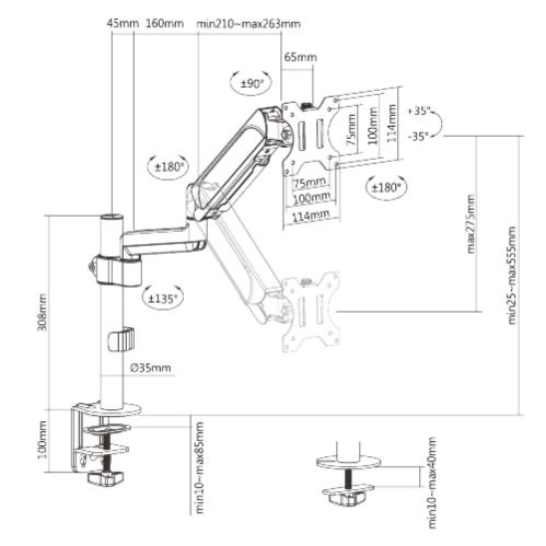 • Flexibilní nastavení polohy: Držák umožňuje snadné nastavení výšky pomocí plynové vzpěry, nastavitelný náklon monitoru v úhlu +35° / -35°, otočení monitoru o 360°, nastavení úhlů ramene o 180°, takže můžete snadno najít optimální pozici pro pohodlné a ergonomické používání. Odnímatelná deska VESA umožňuje snadnou instalaci monitoru.