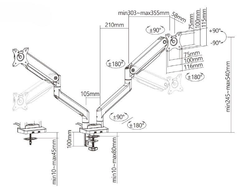 Držiak monitora Brateck LDT60-C024 dve ramená vedľa seba mechanická pružina Heavy Duty