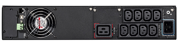 VÝSTUP Kapacita výstupního výkonu [W]: 1980 Kapacita výstupního výkonu [VA]: 2200 Jmenovité výstupní napětí [V]: 230 Topologie: Vysokofrekvenční line interaktiv technologie s funkcí „boost and buck“, čistě sinusový výstup Výstupní přípojky: (8) IEC-320-C13, (1) IEC-320-C19