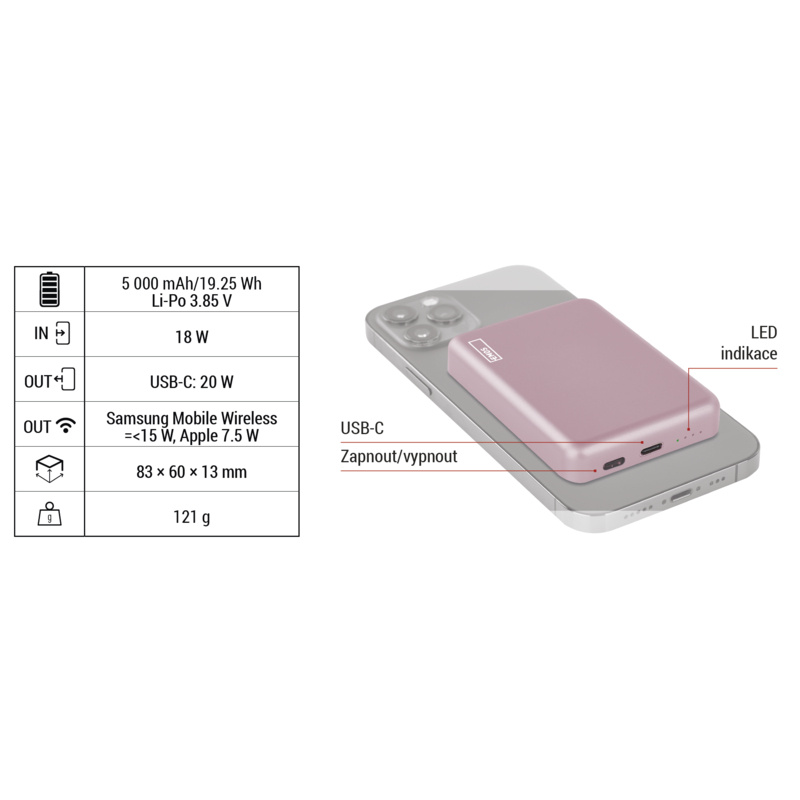 Popis EMOS POWERBANKA WI 522, bezdrôtové nabíjanie 20W, 5.000mAh, LOSOSOVÁ, 1xUSB-C