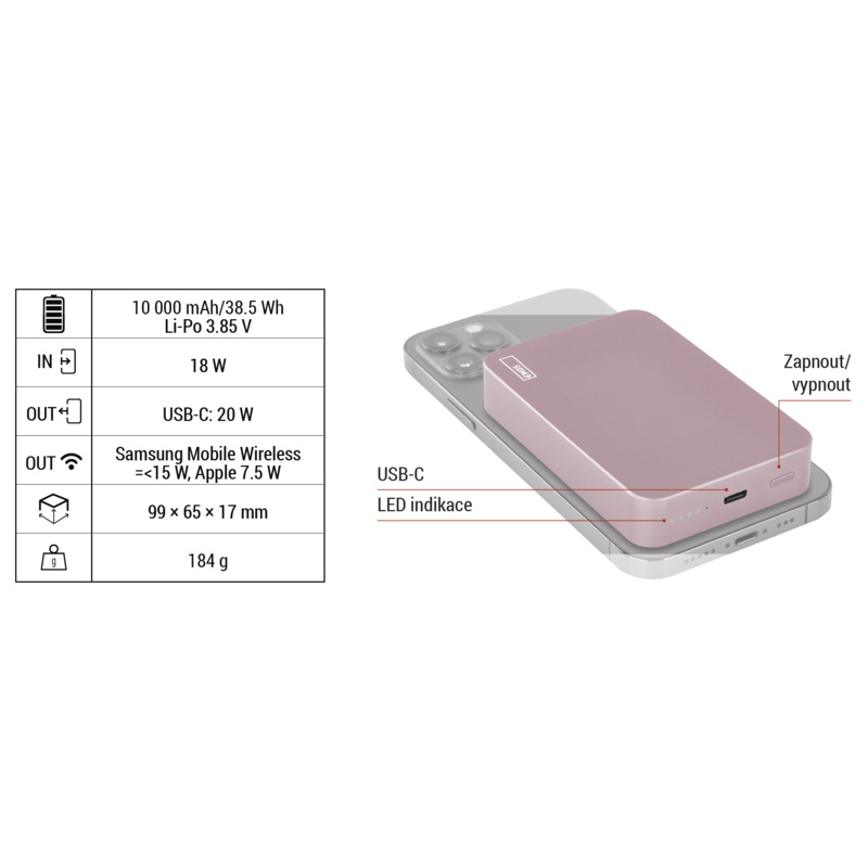 Popis EMOS POWERBANKA WI1046, bezdrôtové nabíjanie 20W, 10.000mAh, LOSOSOVÁ, 1xUSB-C