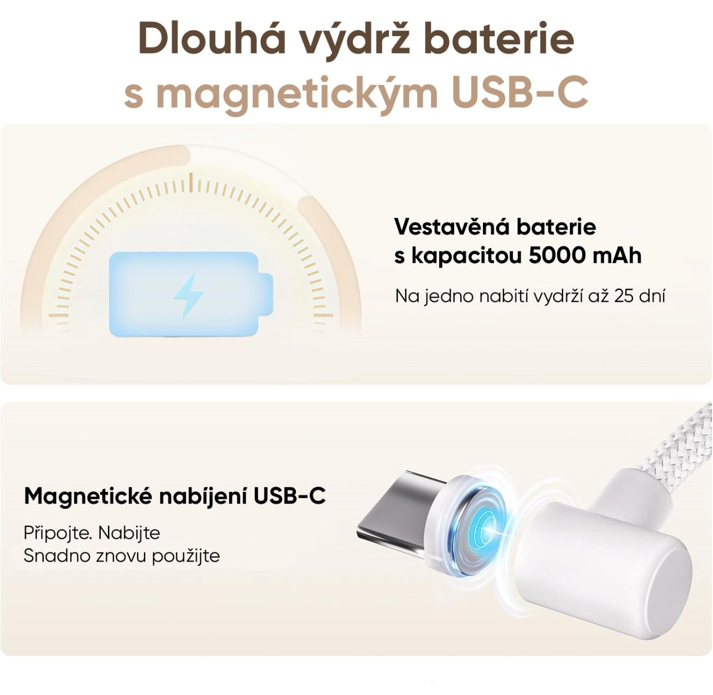 Robot je vybavený akumulátorom s vysokou kapacitou 5000 mAh a zvládne dlhé hodiny prevádzky bez prerušenia. V bežnom prevádzke vydrží až 25 dní. Je vybavený konektorom USB-C s magnetickým adaptérom pre pohodlné nabíjanie.