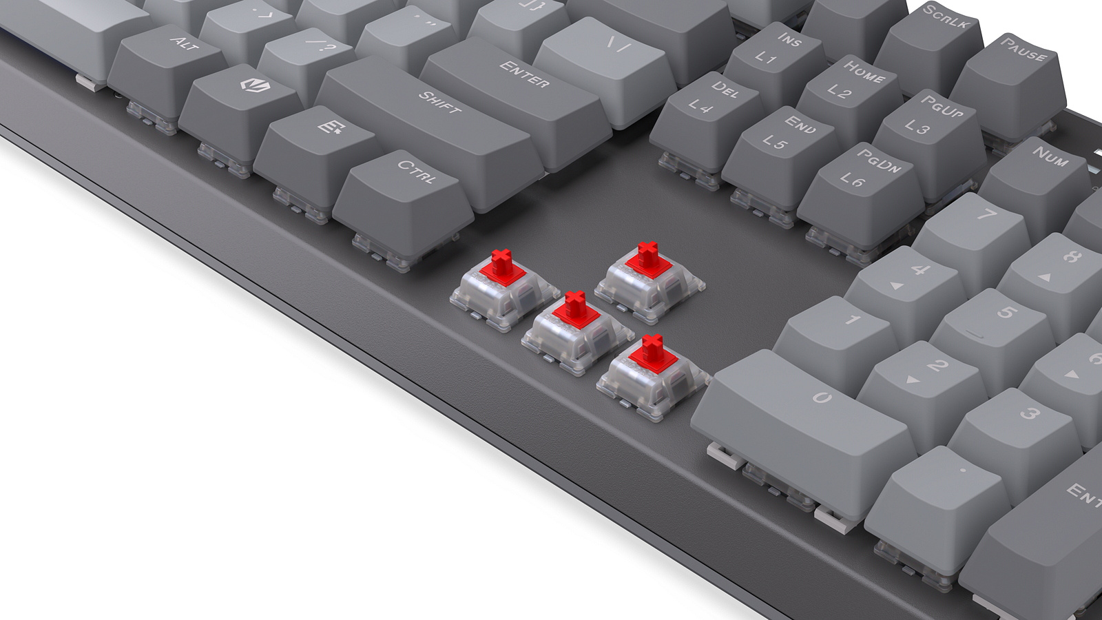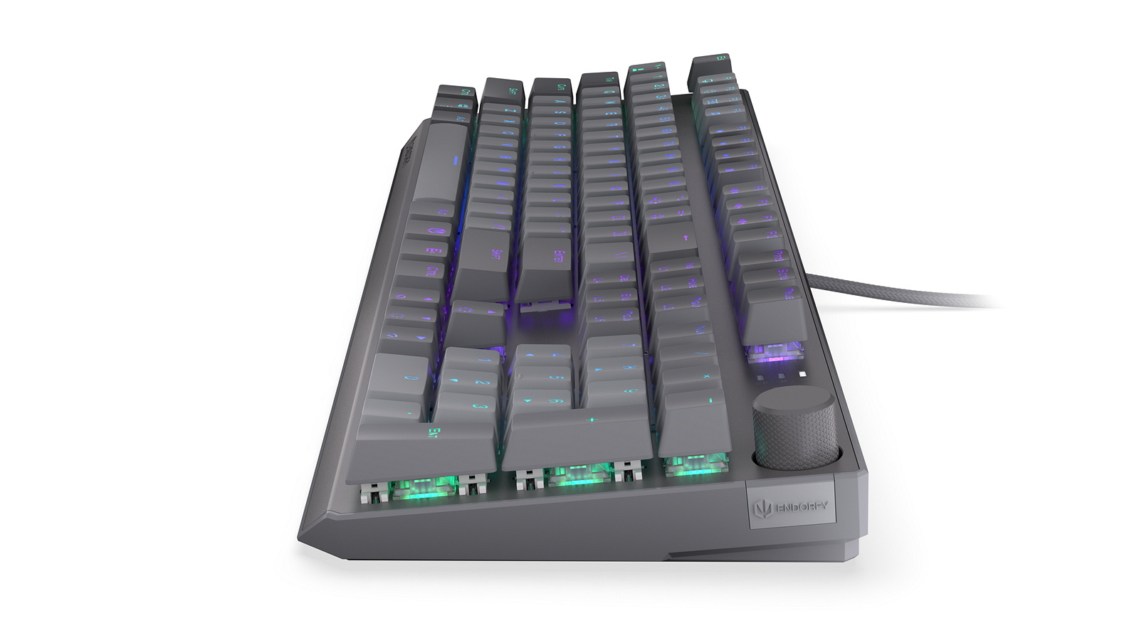 Specifikace Typ klávesnice: mechanická Barva: šedá Rozložení: US ANSI Rozměry: 445,4 × 140 × 42,5 mm Počet kláves: 104 Typ spínačů: ENDORFY Red Barva spínačů: červená Hot-swap: ano Materiál kláves: PBT Typ podsvícení: ARGB