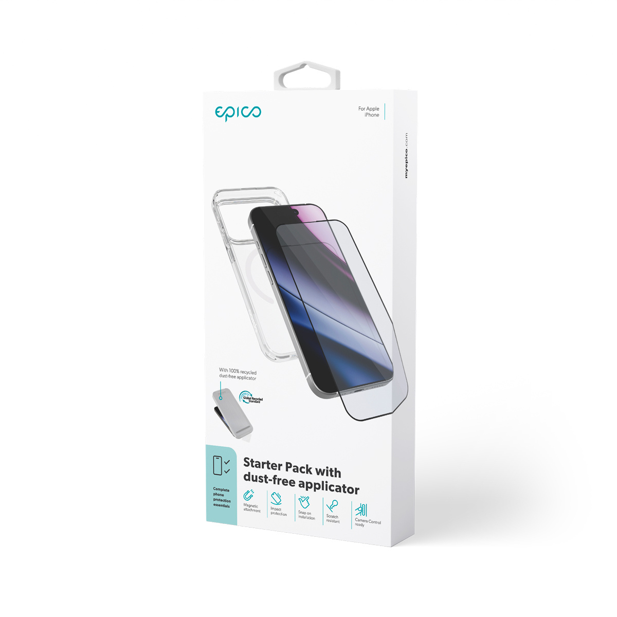 Epico Starter Pack pro iPhone nabízí elegantní kombinaci krytu a ochranného skla, která spolehlivě chrání váš telefon před poškrábáním i pády. Kryt je plně kompatibilní s Qi2 i MagSafe, takže ho není nutné při bezdrátovém nabíjení ani při používání magnetického příslušenství sundávat. Vyvýšené hrany kolem displeje a čoček fotoaparátu poskytují extra bezpečí. Navíc díky integrovanému tlačítku Camera Control zůstává ovládání fotoaparátu vždy plně funkční.