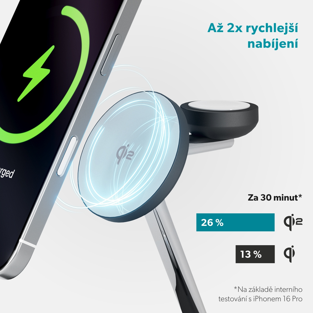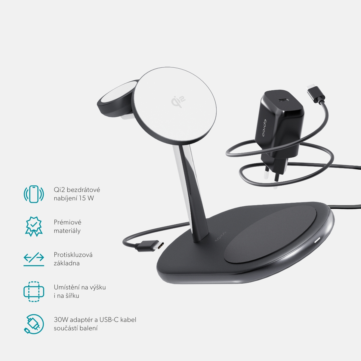 Krásně zpracované řešení pro všechny vaše potřeby nabíjení. Elegantní design: Vyrobeno z prémiových materiálů, které z této nabíječky dělají krásný doplněk na váš stůl. Certifikace Qi2 & kompatibilita s MagSafe. Užijte si až 2x rychlejší bezdrátové Qi2 nabíjení pro iPhone (15W) s pevným magnetickým uchycením. 3v1 nabíjení: Nabíjejte současně smartphone, Apple Watch (5W) i AirPods (5W). Certifikace Made for Apple Watch: Certifikováno společností Apple pro zajištění plné kompatibility s budoucími aktualizacemi a bezchybný výkon Stabilní gumová základna: Vybavena protiskluzovou gumovou základnou pro lepší stabilitu. Flexibilní umístění: Podporuje umístění smartphonu na výšku i na šířku.