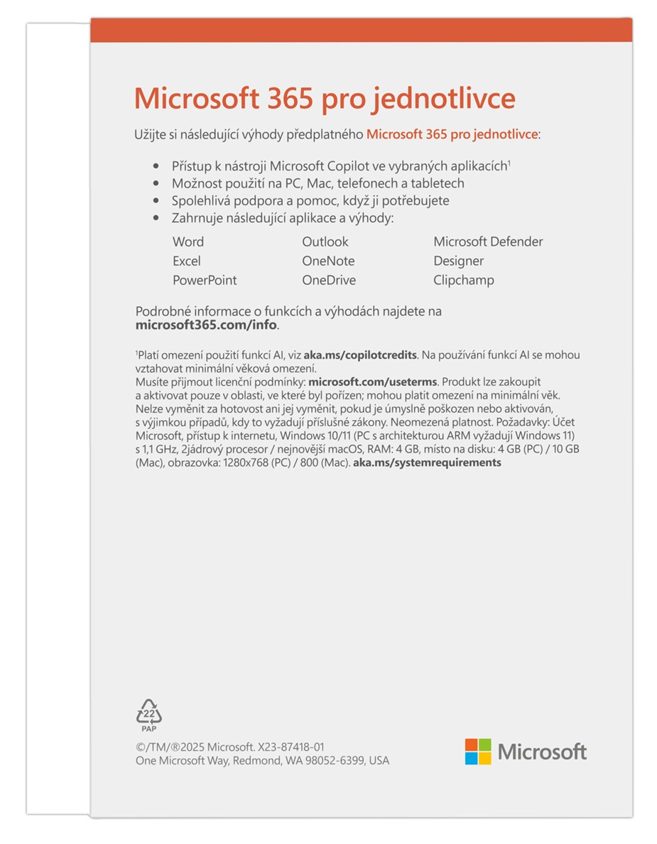 *Pro jednu osobu *Možnost používání až na pěti zařízeních současně *Možnost používání na PC, Macu, iPhonu, iPadu a telefonech a tabletech s Androidem *1 TB (1000 GB) zabezpečeného cloudového úložiště *Kancelářské aplikace s Microsoft Copilotem *Designer pro vytváření a editování obrázků s využitím umělé inteligence *Videoeditor Clipchamp s prémiovými filtry a efekty *Pokročilé zabezpečení v programu Microsoft Defender pro vaše osobní údaje a zařízení *Antiransomwarová ochrana souborů a fotografií na OneDrivu *Průběžná podpora a pomoc, kdykoli ji potřebujete