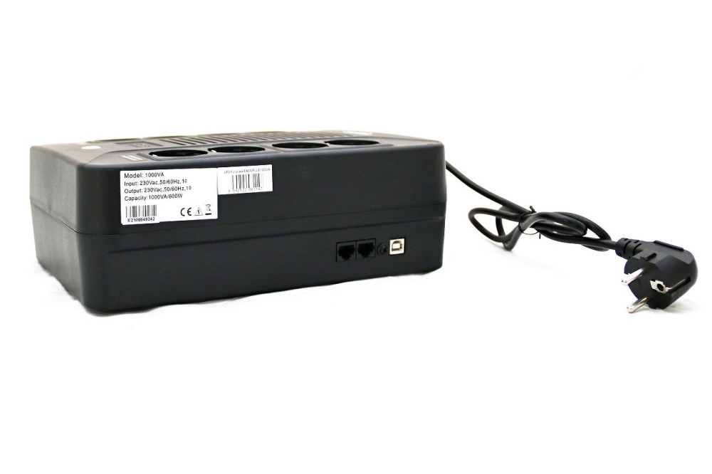 "Line interactive" EA2100P záložný zdroj kompaktných rozmerov. Konštrukcia umožňuje aj zavesenie na stenu Na prednom paneli je vypínač ON/OFF a indikačná LED dióda