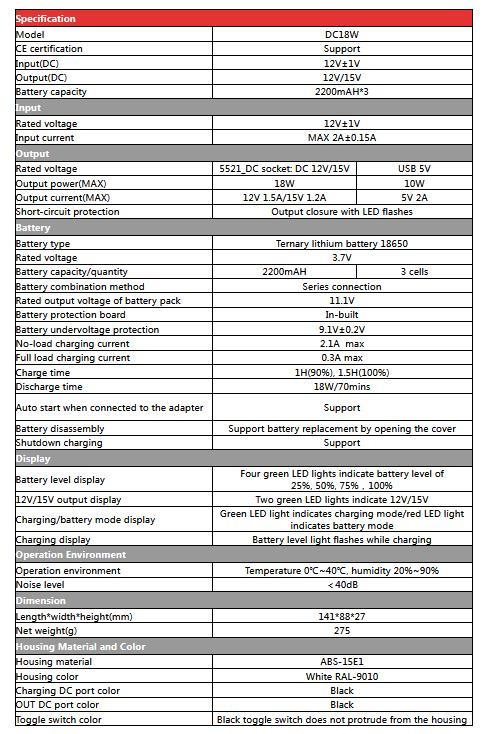- indikácia: 4 stupňový LED indikátor stavu nabitia batérie, indikácia voľby 12V/15V, indikácia režimu Ups (zelená LED nabíjací mód, červená LED batériový mód)