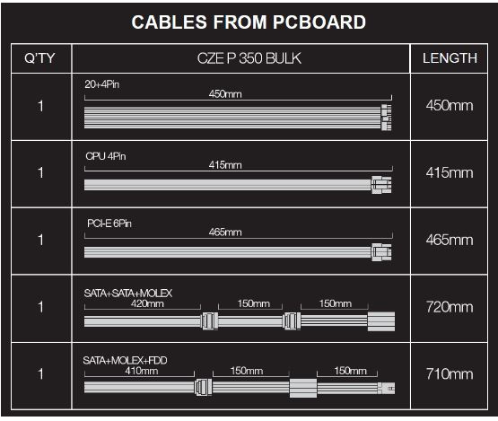 Specifikace • tichý 12cm větrák s regulací otáček • CE certifikace, norma RoHs. • kabeláž v délce 40 cm • 1x napájecí kabel pro MB 20+4pin • 1x napájecí kabel s 1x MOLEX konektorem,1xSATA a 1x fd3 • 1x napájecí kabel cpu 4pin • 1x napájecí kabel s 2x S-ATA a 1x MOLEX konektorem • 1x napájecí kabel VGA PCI-E 6pin