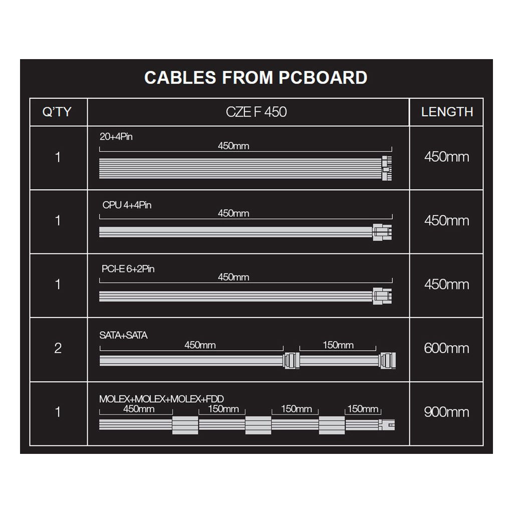Kabeláž • 1x MB 20+4pin 450 mm • 1x cpu 4pin (8pin - 4+4) 450 mm • 1x VGA PCI-E 6+2pin 450 mm • 1x MOLEX, 450mm + MOLEX 150mm + MOLEX 150 mm + FDD 150 mm • 2x kabel S-ATA 450mm+ S-ATA150mm • černá barva