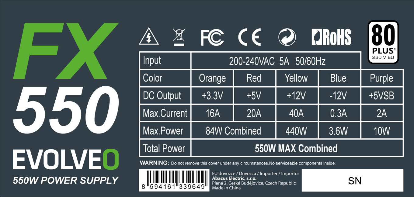 Popis EVOLVEO FX 550, zdroj 550W ATX, 14cm, 80+, White, 3YRW