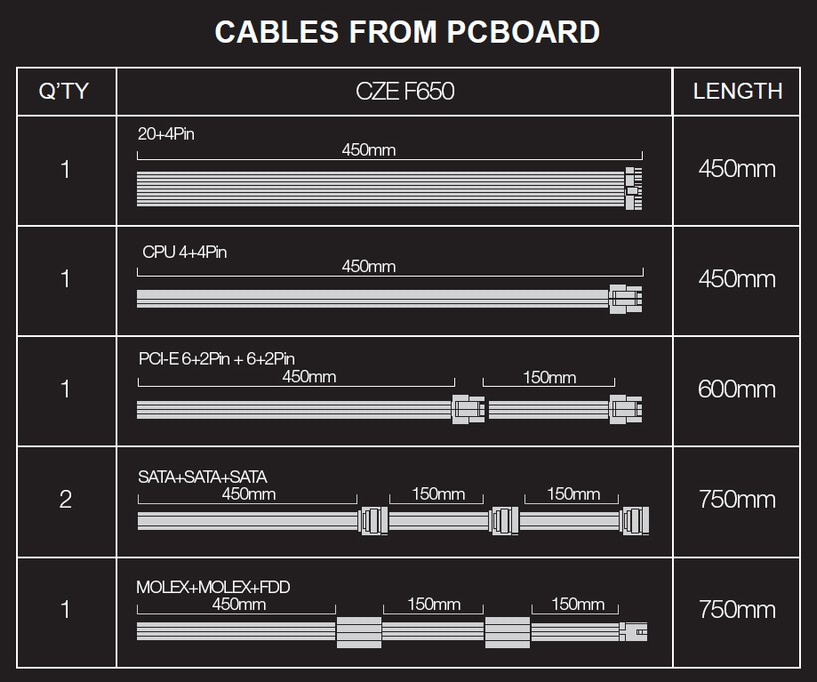 8pin CPU 1x, PCIe 6-pin, PCIe 8-pin, SATA 15-pin, Molex, FDD