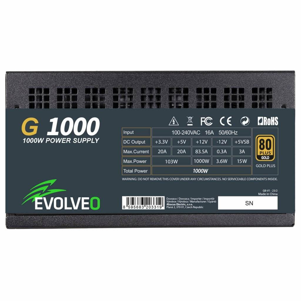 Zdroj EVOLVEO G1000 je ideálna voľba pre herný počítač, ktorý má osadenú grafickú kartu s rozhraním PCIe 5.0. Vyčnieva predovšetkým účinnosťou s certifikáciou 80 PLUS GOLD zaručujúcou účinnosť až 90%. Zdroj je plne modulárny, preto je možné pripojiť len najsilnejšie káble. Súčasťou je aj tichý 140mm ventilátor. V kombinácii s semi-pasívnym chladením do 30% zaťaženia je zaručený tichý chod zdroja. Semipasívne chladenie, ventilátor zdroja je zvyčajne neaktívny a spustí sa iba pri prekročení 20% hranice výkonu zdroja. Nedeliteľnou súčasťou sú aj ochrany proti poškodeniu komponentov v PC a aj samotného zdroja.