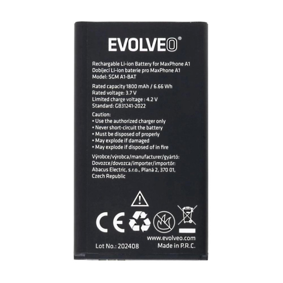 Originálna batéria EVOLVEOUrčená pre mobilný telefón EVOLVEO MaxPhone A1Kapacita 1800 mAhTyp batérie: Li-IonObsah balenia:Batéria
