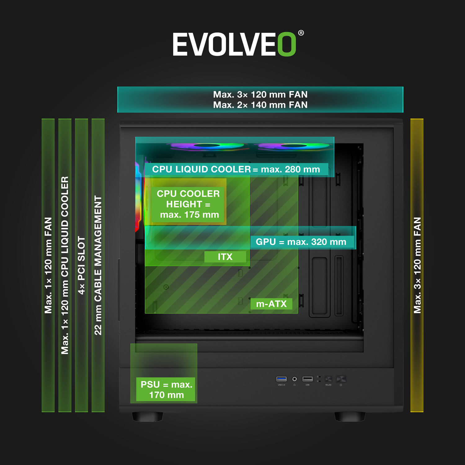 Vnitřní prostor herní PC skříně EVOLVEO Panthera-BK-3 je dostatečně velký a hlavně promyšlený do posledního detailu. Hravě tak pojme vše, co si gamingový počítač žádá. Vejde se sem až 320 milimetrů dlouhá grafická karta, zatímco chladič CPU může měřit až 175 milimetrů na výšku. Také je tu k vašim službám čtveřice rozšiřujících PCI slotů. A úložiště? K dispozici tady máte místo na dva 3,5" pevné disky a jednu 2,5" SSD jednotku, takže si bez problému zajistíte úložný prostor na sbírku her, multimédia i pracovní soubory. Nevzhlednou kabeláž uvnitř skříně přitom skryje 22milimetrový Cable Management.
