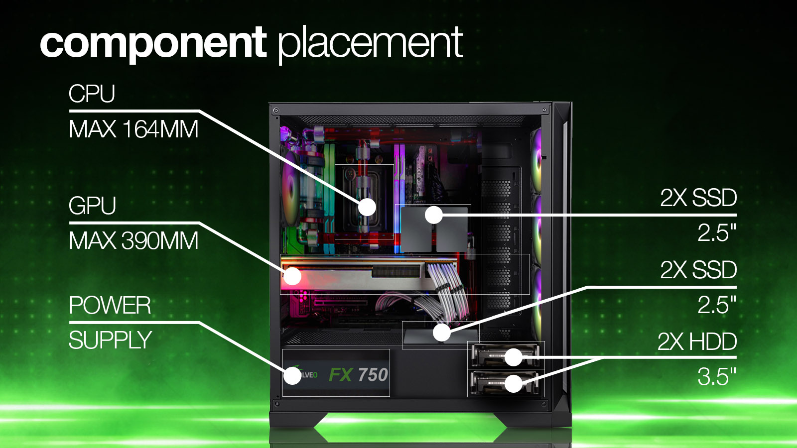 Vnitřní prostor této herní počítačové skříně je navržen tak velkoryse, že může být základem i pro ty nejambicióznější počítačové sestavy. Chladič procesoru může měřit až 164 mm na výšku. Grafická karta se sem vejde v délce až 390 mm. A pro ukládání dat je k dispozici místo pro 2 klasické pevné disky (3,5") a 3 moderní rychlá SSD úložiště (2,5"). Každá hardwarová součástka je zkrátka v této digitální pevnosti vítaným hostem a dostane se jí péče jako na císařském dvoře. Roli přitom nehraje ani její urozený původ – do skříně se dají vložit základní desky Intel i AMD, přičemž jsou podporovány formáty ATX, eATX (Extended ATX), mATX (Micro ATX) i mITX (mini ITX).