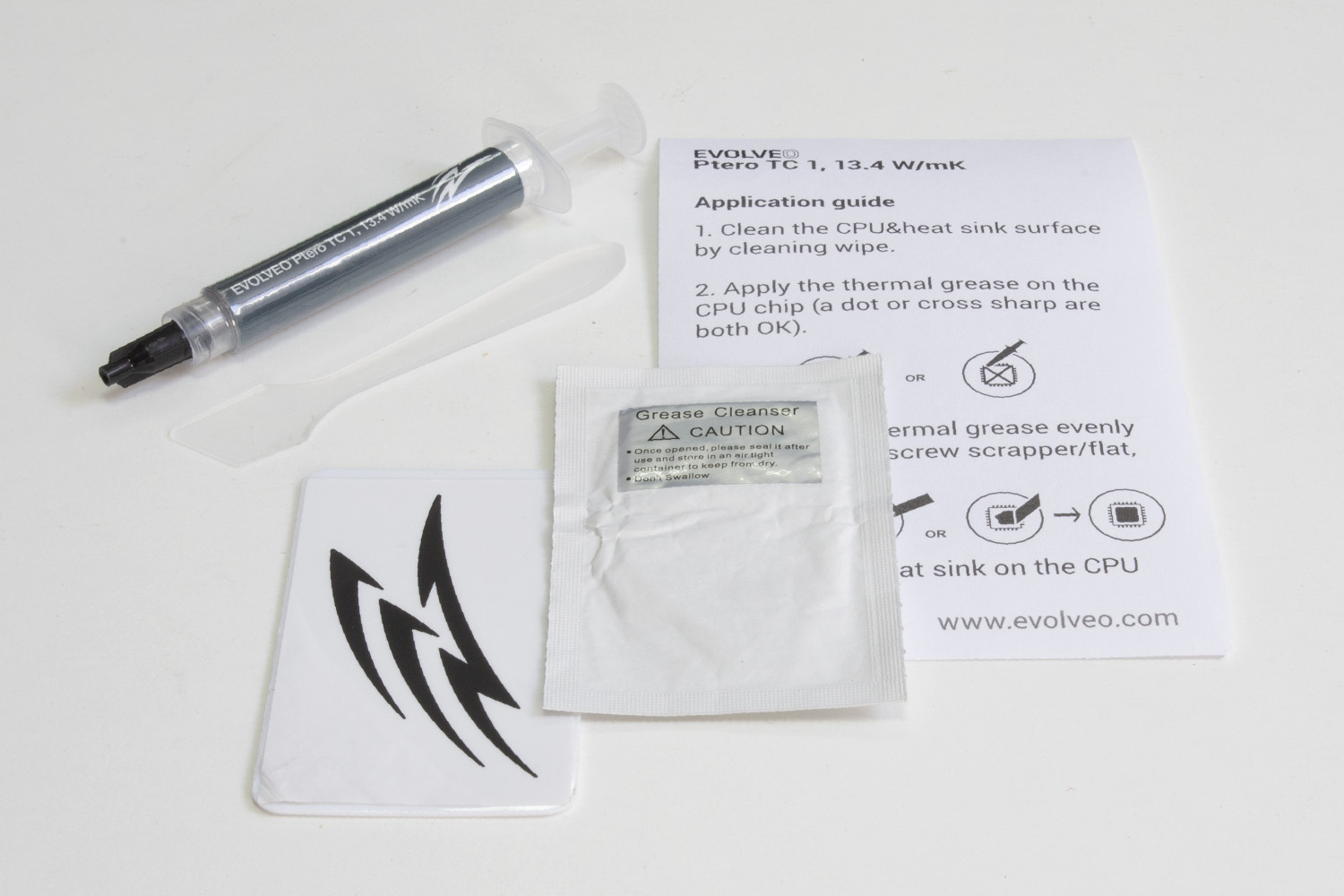 • Teplovodivá pasta (2 g) • Špachtle pro snadné rozetření • Čistící ubrousek • Manuál