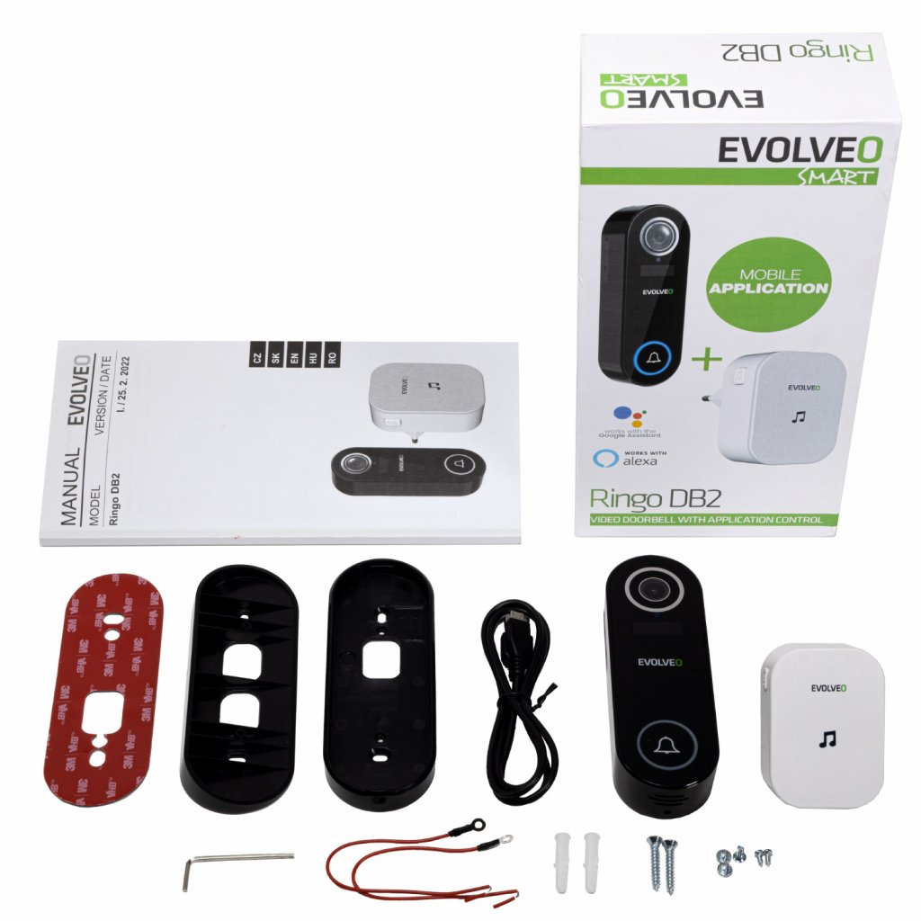 • EVOLVEO Ringo DB2, chytrý videozvonek • Zvonek do zásuvky • Uživatelský manuál • Plochá montážní konzole • Úhlová montážní konzole • 3M samolepící montážní nálepka • Nabíjecí kabel USB • Malý inbusový klíč • Bezpečnostní šroub • 2x montážní šroub + hmoždinky • 2x montážní šrouby pro úhlovou konzoli • 2x připojovací vodiče pro pevnou kabeláž • 2x šrouby pro připojení vodičů