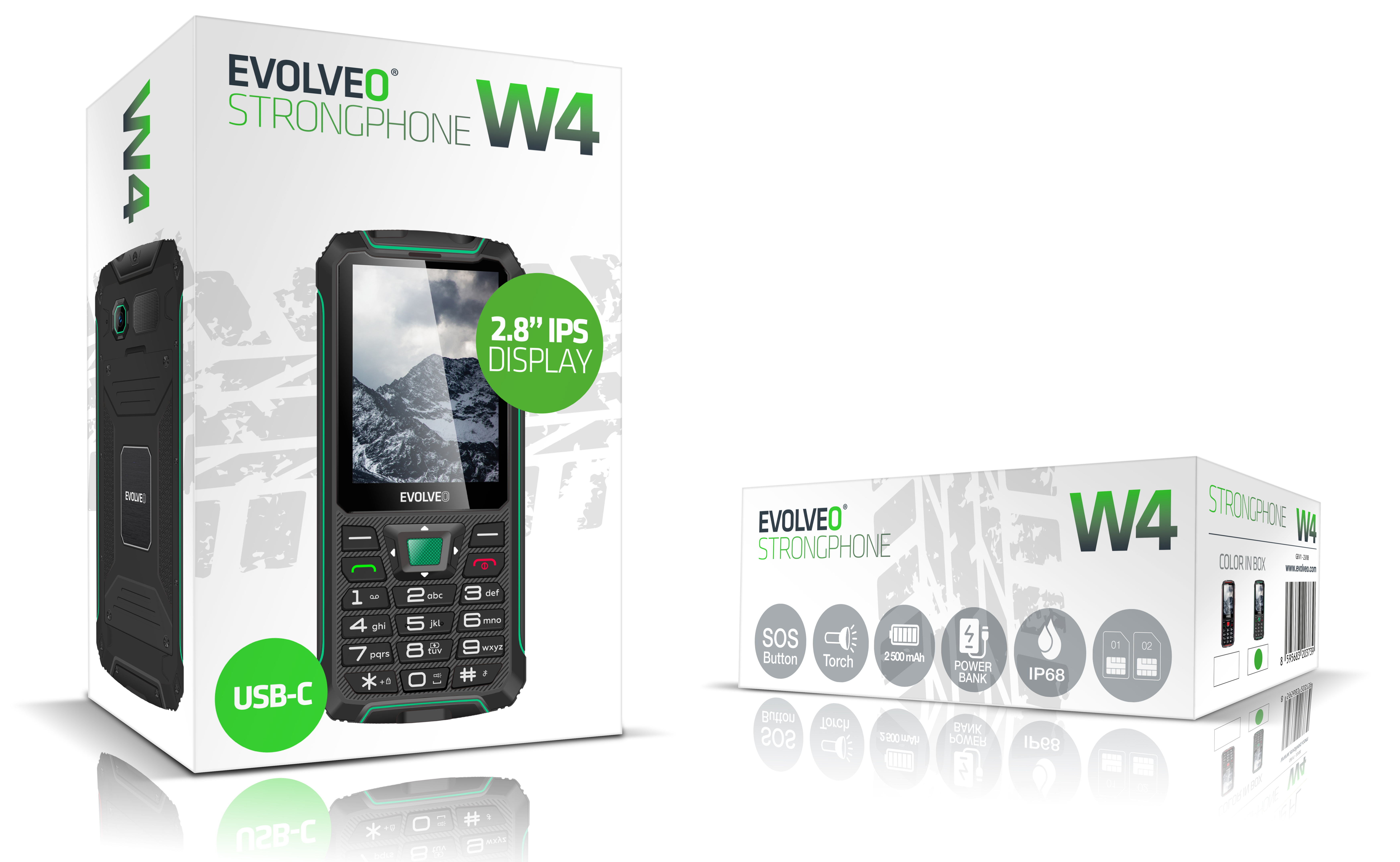 Popis EVOLVEO StrongPhone W4, vodotesný odolný Dual SIM telefón, čierno-zelená