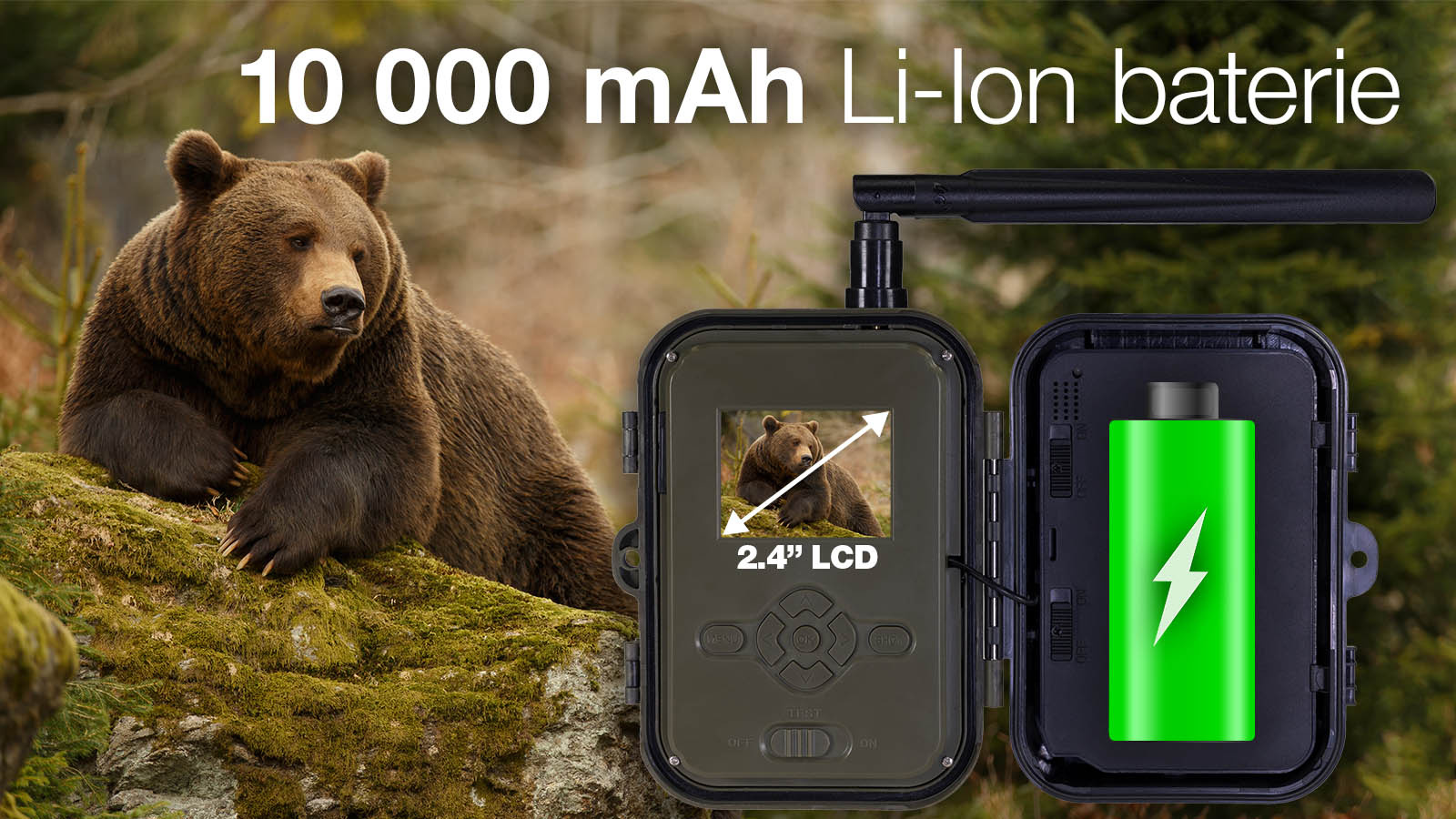 Jeden z důležitých parametrů každé fotopasti je její výdrž na baterii a zároveň i ekonomika provozu, díky nabíjecí 10 000 mAh baterii získáte zařízení s dlouhou výdrží na jedno nabití. Baterie je přímo vybavena nabíjecím konektorem a indikační LED diodou informující o stavu nabíjení.Akumulátor je dokoupitelný jako příslušenství, takže není problém používat dvě baterie, a jednou za několik měsíců jen vybitou baterii v kameře vyměnit za čerstvě nabitou. Samozřejmě že výdrž se může lišit při různých nastaveních (častý záznam videa) a také vlivem okolní teploty, kdy při teplotách bod bodem mrazu výdrž klesá.