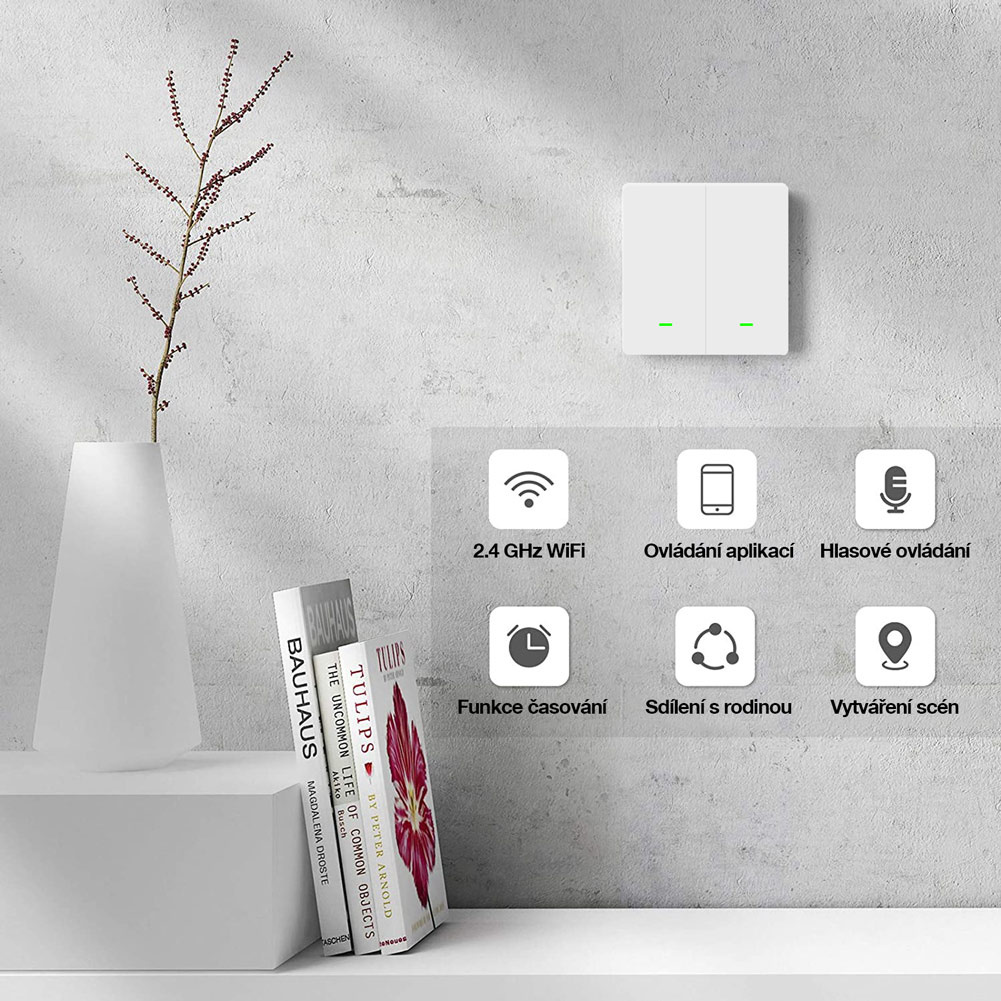 Chytrý vypínač nabízí flexibilní způsoby ovládání, které se přizpůsobí vašim preferencím. Můžete světla zapínat a vypínat prostřednictvím tlačítek přímo na vypínači, pohodlně pomocí mobilní aplikace nebo jednoduše hlasovými příkazy. Tato široká škála možností umožňuje ovládat osvětlení dle potřeby.