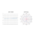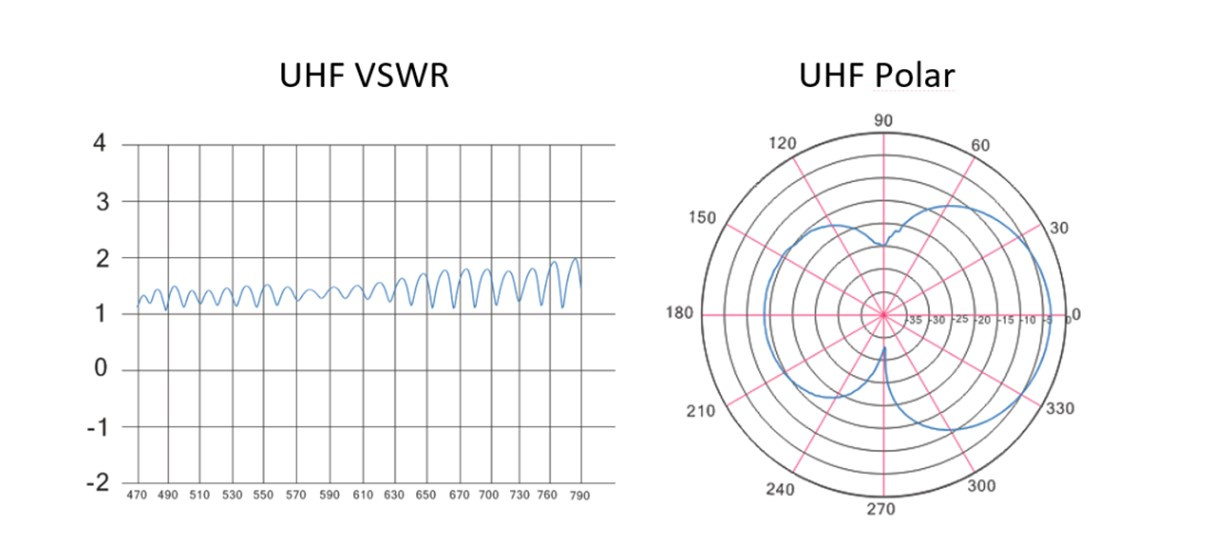 UHF VSWR graf zobrazuje účinnost antény v pásmu UHF. Koeficient rovný 1 znamená přeměnu všech elektromagnetických vln na elektrický signál. S grafem UHF Polar je možné pozorovat oblasti prostoru antény s nejlepším ziskem. Anténa Xany 2in1 je směrová, to znamená nejlepší příjem signálu v případě natočení antény k vysílači.