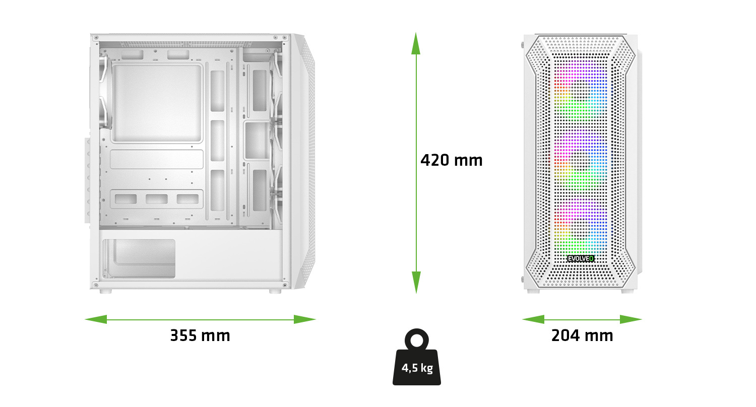 Na první dobrou byste možná řekli, že počítačová skříň o rozměrech 204 × 420 × 355 mm a hmotnosti 4,5 kg nemůže nabízet nic extra. Jenže to by nesměla být řeč o EVOLVEO Xenon-WH-4 – počítačové skříni, u které je přijatelná velikost v dokonalé rovnováze s velkorysostí vnitřního prostoru. Její zásluhou se vám stolní počítač bez problému vejde na stůl i do skromného herního koutku, ovšem do nitra skříně se vejde vše, co si vaše neskromné herní ambice žádají. Skříň je kompatibilní s klasickými napájecími zdroji ATX a se základními deskami ve formátech ATX, mATX (Micro ATX) i mITX (mini ITX) , přičemž jsou podporovány desky značky Intel i AMD. Máte tak volnost sestavit si počítač přesně podle svých představ. Okno, kterým můžete vyhlížet herní úspěchy