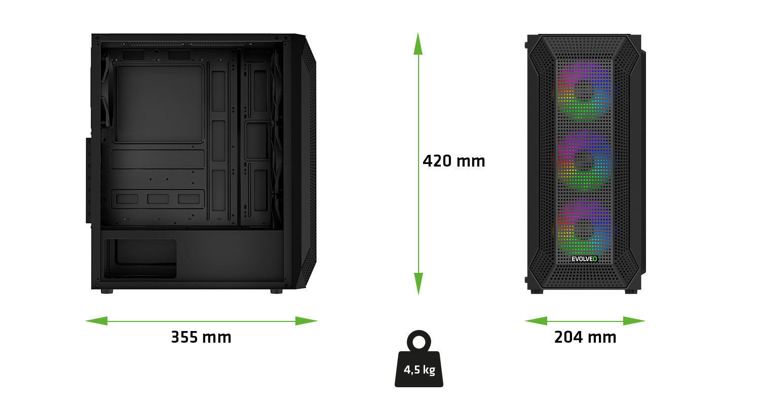 Na první dobrou byste možná řekli, že počítačová skříň o rozměrech 204 × 420 × 355 mm a hmotnosti 4,5 kg nemůže nabízet nic extra. Jenže to by nesměla být řeč o EVOLVEO Xenon-WH-4 – počítačové skříni, u které je přijatelná velikost v dokonalé rovnováze s velkorysostí vnitřního prostoru. Její zásluhou se vám stolní počítač bez problému vejde na stůl i do skromného herního koutku, ovšem do nitra skříně se vejde vše, co si vaše neskromné herní ambice žádají. Skříň je kompatibilní s klasickými napájecími zdroji ATX a se základními deskami ve formátech ATX, mATX (Micro ATX) i mITX (mini ITX) , přičemž jsou podporovány desky značky Intel i AMD. Máte tak volnost sestavit si počítač přesně podle svých představ. Okno, kterým můžete vyhlížet herní úspěchy