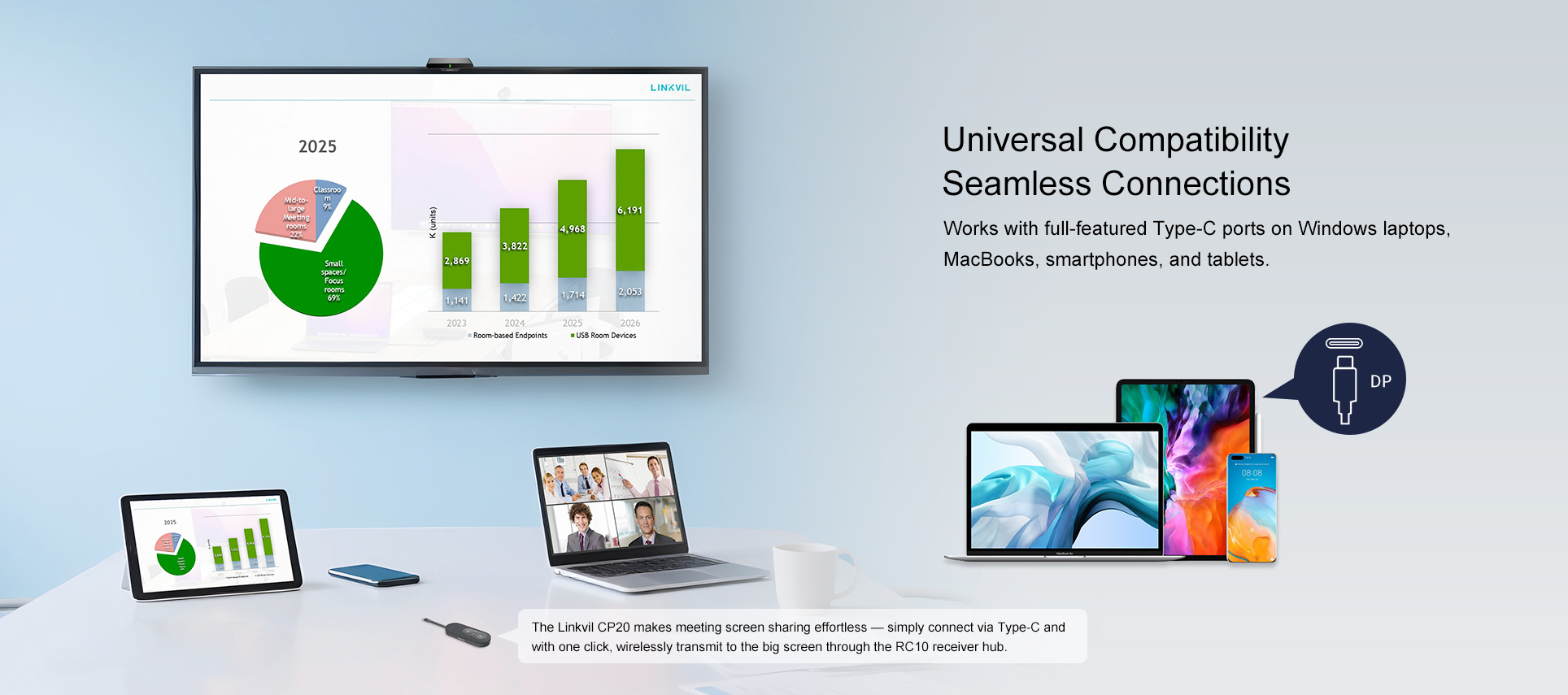 Linkvil CA200 je bezdrátová konferenční sada navržená pro zjednodušení nasazení a zvýšení efektivity schůzek. Díky integrovanému vysílači a přijímači může jeden rozbočovač CA200 současně připojit až čtyři pody pro sdílení obrazovky CP20 – není nutná žádná systémová integrace. Stačí jej zapojit a můžete začít s ním pracovat. Podporuje bezdrátové vysílání v rozlišení 4K a umožňuje bezproblémové přepínání do režimu zmrazení, což umožňuje plynulé prezentace a flexibilní spolupráci v různých scénářích. CA200 je kompaktní a přenosná, kompatibilní s více zařízeními, což pomáhá eliminovat nepořádek s kabely a vytvořit čistší a produktivnější prostředí pro schůzky.