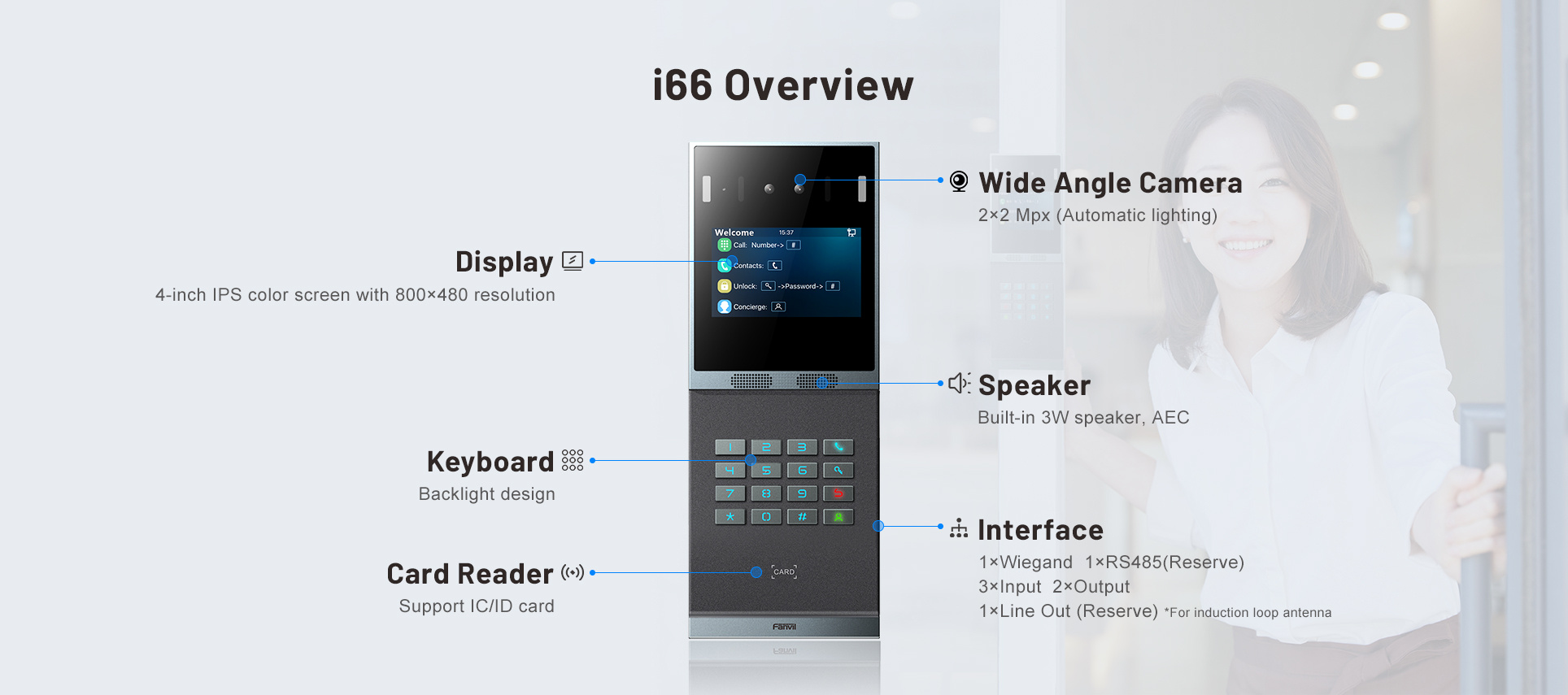 Dveřní interkom i66 s rozpoznáváním obličeje je vybaven 4palcovou barevnou obrazovkou IPS a obsahuje vysoce přesnou technologii rozpoznávání obličeje. Obsahuje detekci živosti proti falšování obrázků, videí a masek, čímž maximalizuje zabezpečení komunity. Navíc podporuje audio a video komunikaci s IP telefony, vnitřními stanicemi nebo prostřednictvím mobilní aplikace. Díky více metodám otevírání dveří je široce použitelný ve scénářích komunit, bytů a kancelářských budov.