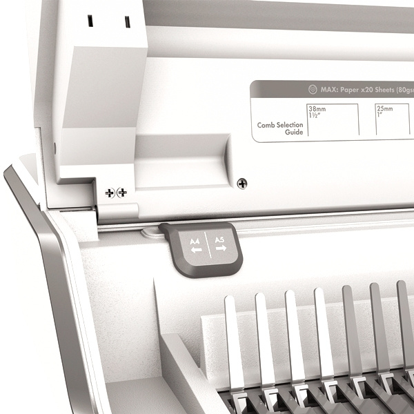 VAZBA Děrovací kapacita až 20 listů 80 g papíru. Kapacita vazby až 300 listů, maximální průměr hřbetu 38 mm. Je vhodný pro intenzivní kancelářské použití. Vkládání děrovaných listů shora pro snadné setřesení a tím bezchybnou perforaci.