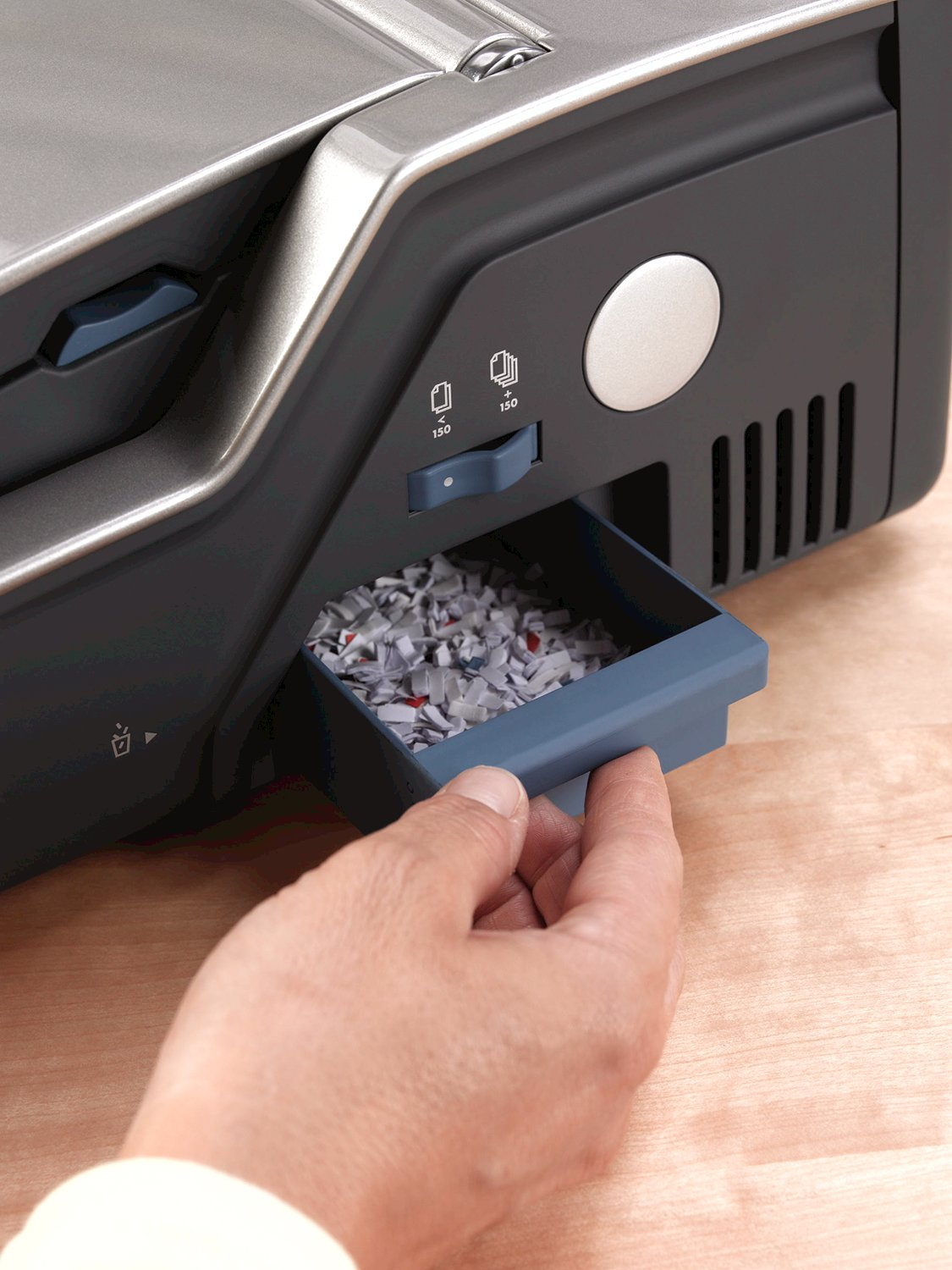 Velký odpadní šuplík s možností uložení plastový hřbetů. Integrovaná měrka pro správnou volbu průměru hřbetu. Na čelní straně stroje je průzor pro snadnou kontrolu zaplnění odpadního prostoru.