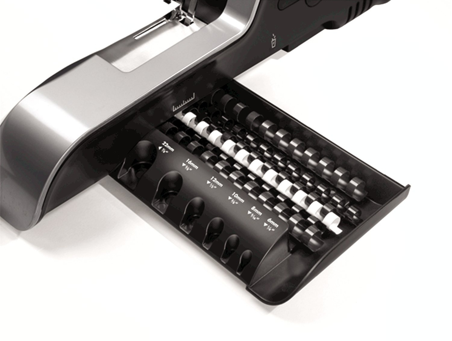 Stroj je vybaven větším zásobníkem na uložení několika plastových hřbetů a integrovanou měrkou pro správnou volbu průměru hřbetu. Na čelní straně stroje je průzor pro snadnou kontrolu zaplnění odpadního prostoru.