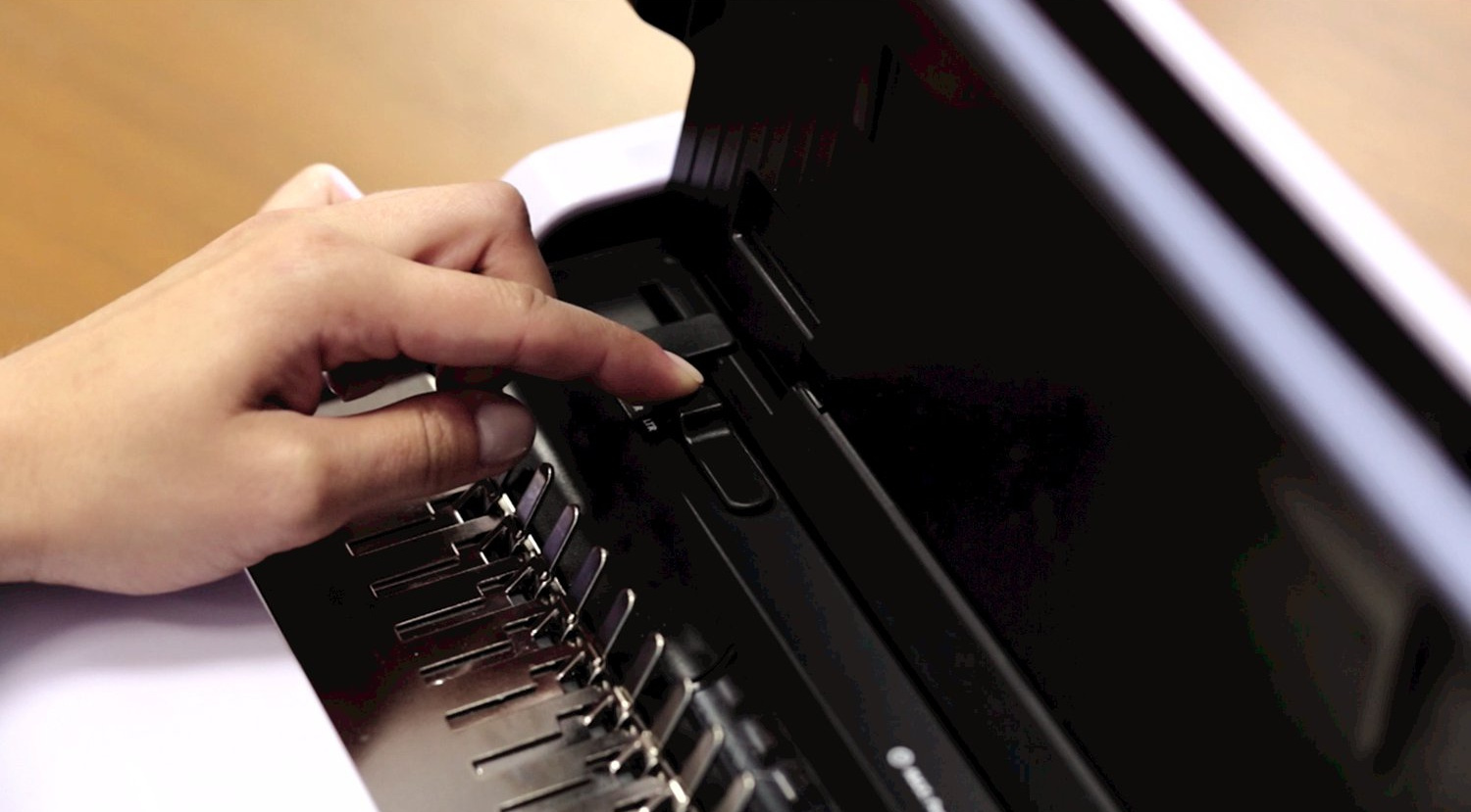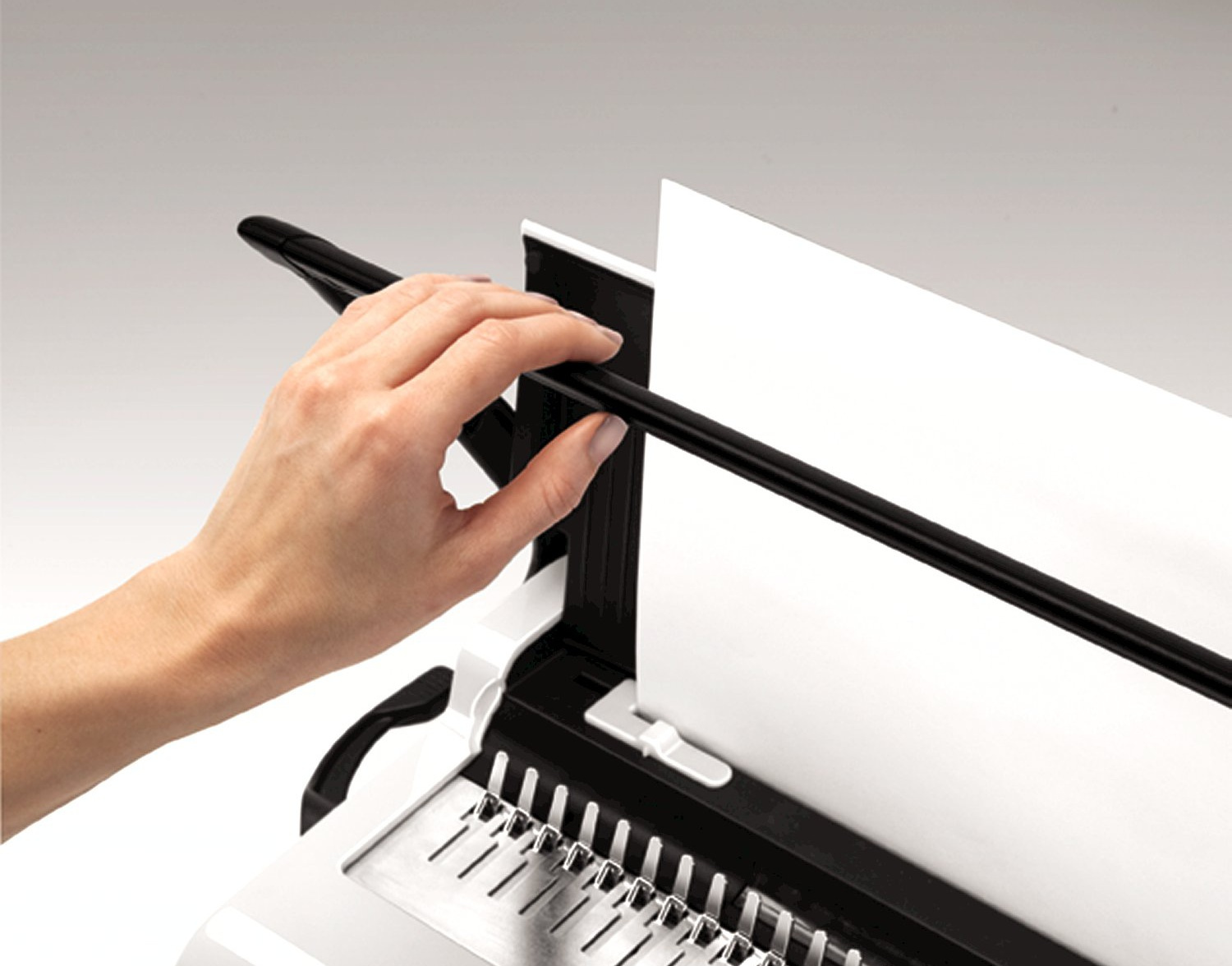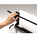 Oddělená ergonomická děrovací a vázací páka pro průběžné vkládání děrovaných listů do plastového hřbetu výrazně zefektivňuje práci. Vkládání děrovaných listů shora pro snadné setřesení a tím bezchybnou perforaci.