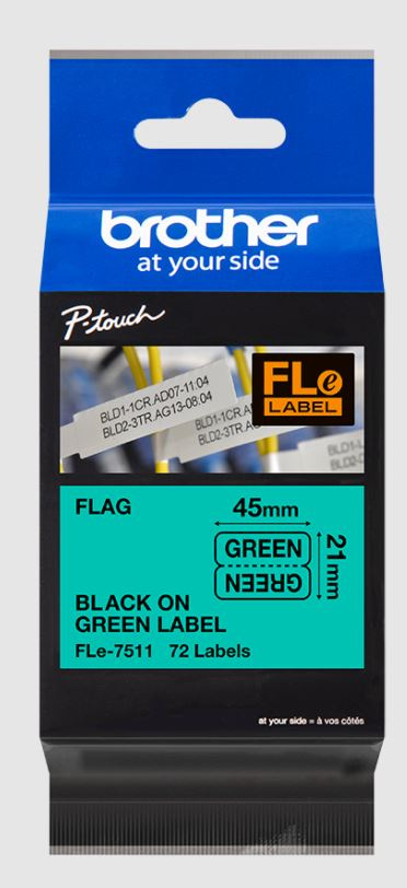Tato popisovací černo-zelená páska FLe-7511 je ideální jak pro identifikaci kabelů tak pro univerzální použití. Jednoduše vytiskněte text nebo čárový kód na dvě části předřezaného štítku. Připevněte proužek štítku kolem kabelu, poté vezměte vytištěný předřezaný štítek a jednu polovinu přilepte na proužek štítku a poté jej přeložte přes druhou polovinu.