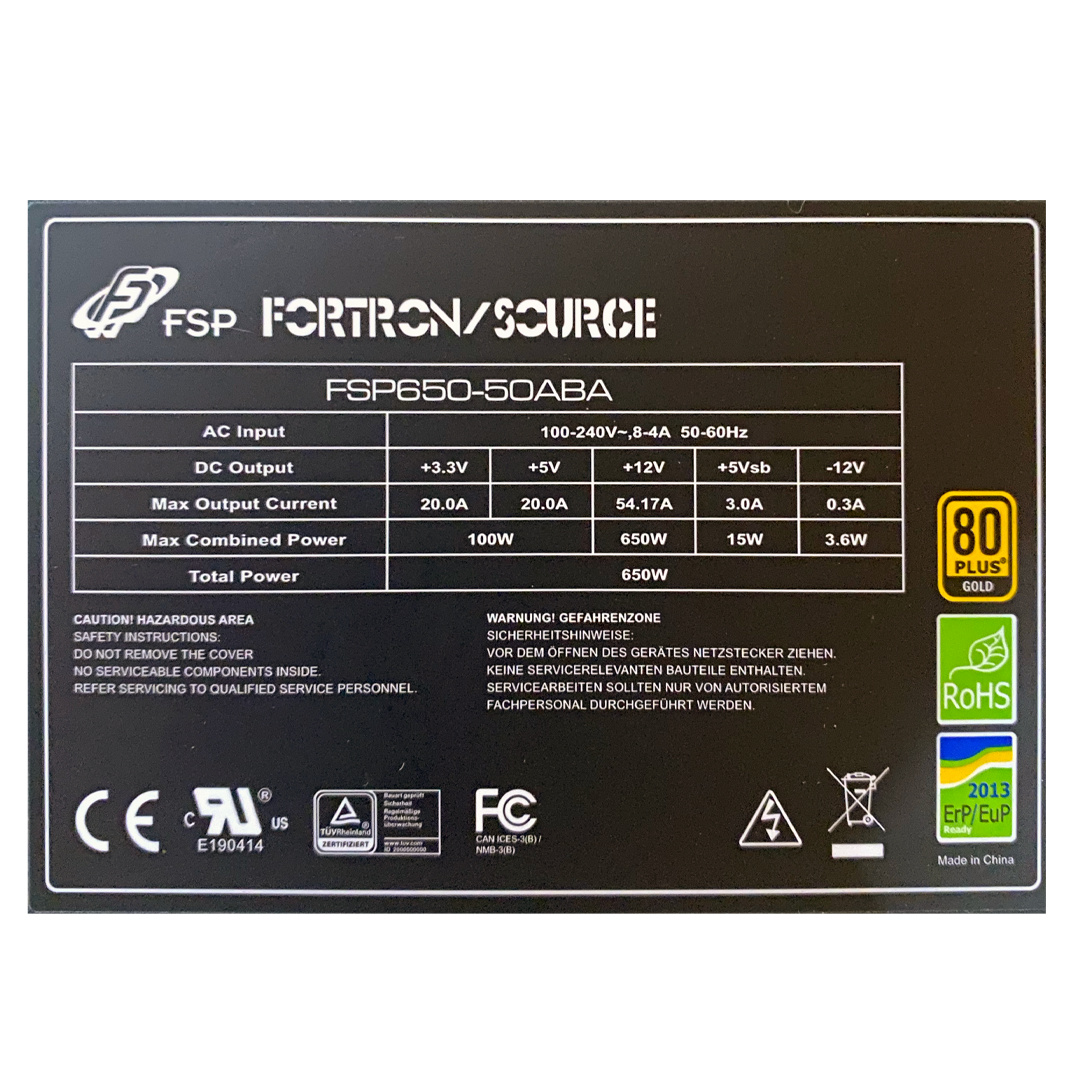 Zdroj řady FSP ABA s ekologickým designem, který umožňuje řadě ABA dosáhnout až 90% účinnosti. Řada ABA je také vybavena kompletní ochranou, která zabrání poškození systému. Řada ABA dělá práci efektivně a spolehlivě, což z ní dělá stabilní napájecí zdroj postavený tak, aby uspokojil požadavky všech druhů sestavení systému. Vlastnosti *Certifikováno CB 62368-1 *80 Plus Gold *Intel Design ATX 12V V1.4 *Nízký hluk *Nadproudová ochrana *Ochrana proti přehřátí *Ochrana před vysokým napětím Technické parametry *Model: FSP650-50ABA *Formát: ATX *PFC: Aktivní PFC *Ventilátor: 120mm *Rozměry: 140 x 150 x 86 mm *Vstupní napětí: 90-264Vac *Frekvence: 47-63Hz *Výkon: 650W *Certifikace 80PLUS: 80PLUS Gold Konektory: *1x 20+4 pin MB *1x 4+4 CPU *2x 6+2 PCI-E *2x PCI-E 6pin *4x SATA *4x Molex *1x Floppy