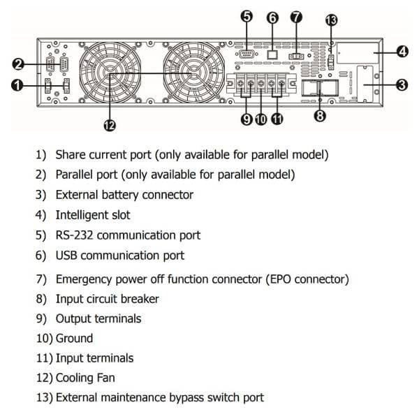 Jedná se o „Long run“ model, který neobsahuje baterie a je potřeba dokoupit příslušný počet battery bank.VÝSTUPKapacita výstupního výkonu [W]: 10000 Kapacita výstupního výkonu [VA]: 10000 Výstupní napětí [V]: 208/220/230/240VAC Topologie: On-line Single Phase Typ křivky: Sine wave VSTUPVstupní napětí [V]: 140~300V @ (60~80%) Load Kmitočet na vstupu [Hz]: 46Hz ~ 54 Hz @ 50Hz system 56Hz ~ 64 Hz @ 60Hz system Rozsah vstupního napětí [VAC]: 110~300Vac @ (0~60%) Load / 176~300Vac @(80~100%)Load BATERIE A DOBA BĚHUTyp baterie: bez baterie KOMUNIKACE A SPRÁVAPort rozhraní: USB, RS-232, EPO FYZICKÉMaximální výška [cm]: 8,8 Maximální šířka [cm]: 43,8 Maximální hloubka [cm]: 60 Čistá hmotnost [kg]: 20 Barva: černá Provozní teplota [°C]: 0 ~ 40 Hlučnost [dB]: méně než 58 dB na 1 metr Věnujte zvýšenou pozornost správnému nastavení stálého a maximálního nabíjecího proudu dle manuálu, aby nedošlo k poškození baterií. Výchozí hodnota je nastavena na 4 A, avšak baterie instalované v připojovaném battery packu mohou podporovat nižší nabíjecí proud. Doporučené nastavení je 1 A nebo 2 A.UPS selector: https://energy.fsp-europe.com/ -> Tools -> UPS SelectorOdkaz na stránky výrobce: https://energy.fsp-europe.com/product/clippers-10kl/ Video k Software ViewPower: https://www.youtube.com/watch?v=r3P4zmNBzjc