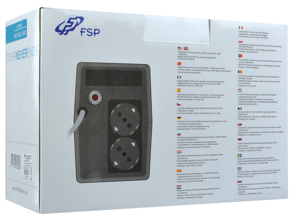 Hlavní vlastnosti: * Kompaktní velikost * Vynikající mikroprocesorové řízení zaručuje vysokou spolehlivost * Stabilizace napětí (boost and buck AVR) * Simulovaná sinusová křivka * Dobíjení i ve vypnutém stavu * Funkce studeného startu (bez připojení do elektrické sítě) * Retailové balení v krabici * Záruka 2 roky na UPS i baterii