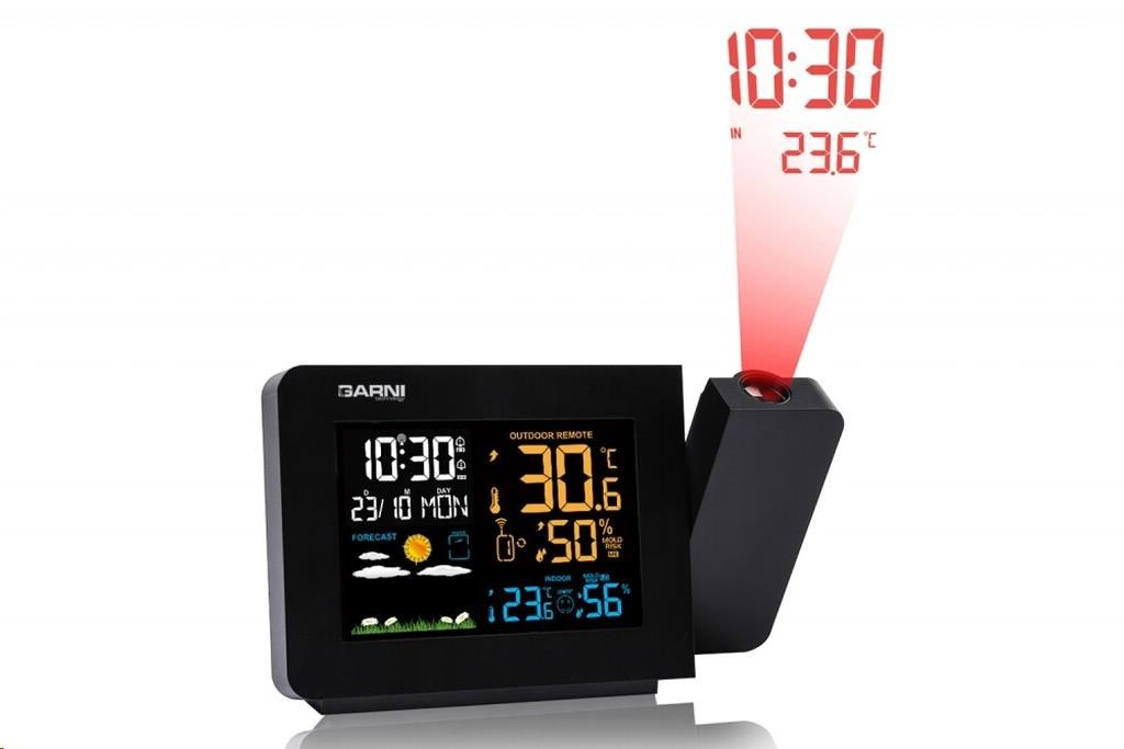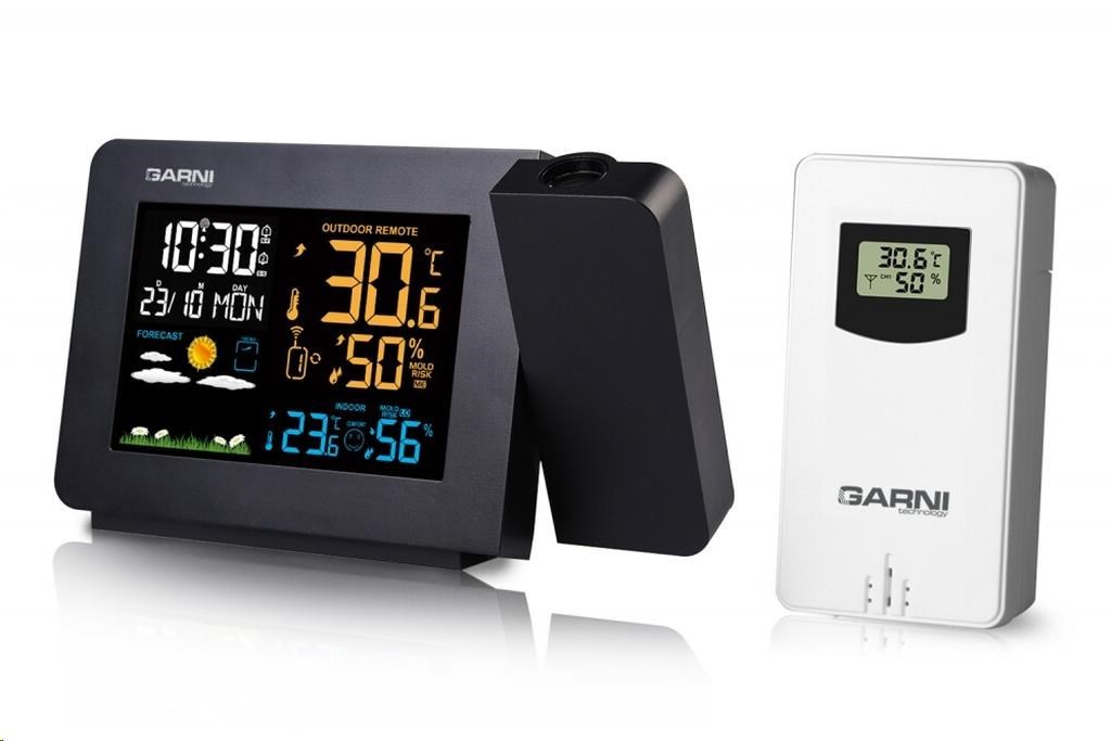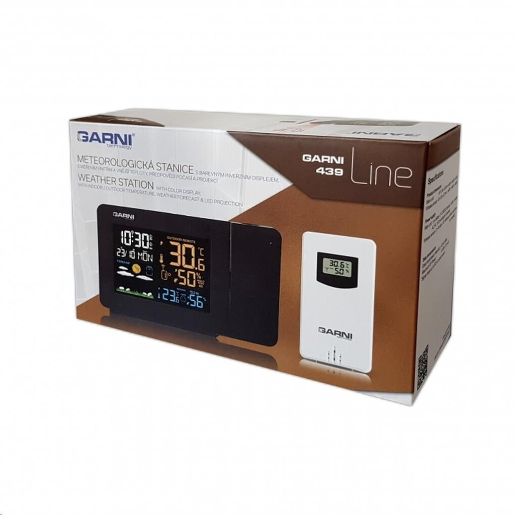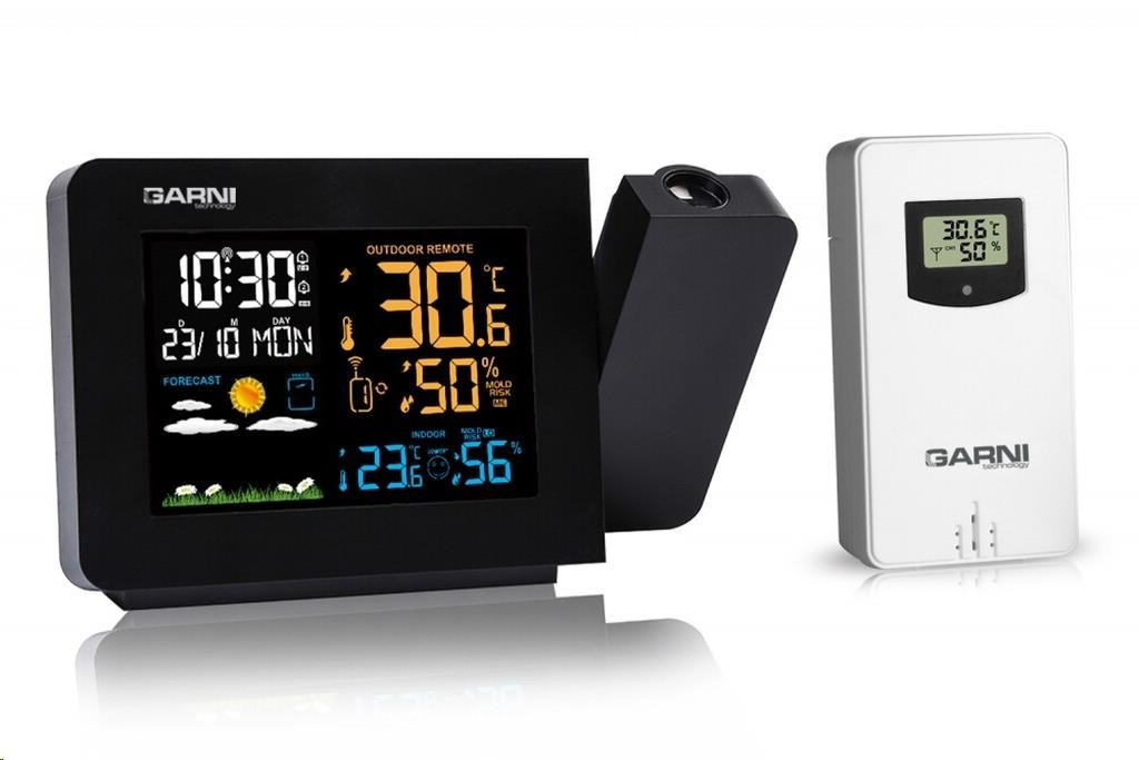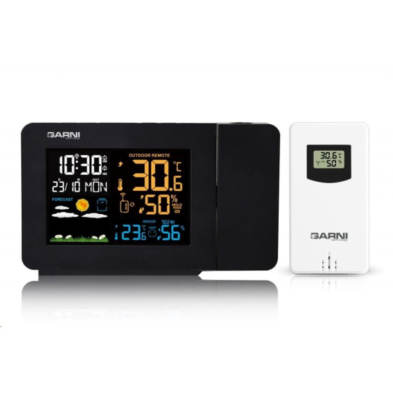 Meteorologická stanica s špičkovým inverzným farebným VA displejom s časom riadeným rádiovým signálom DCF-77, budíkom, meraním vnútornej teploty a relatívnej vlhkosti, bezdrôtovým snímačom pre meranie vonkajšej teploty a relatívnej vlhkosti a projekciou času a vnútornej / vonkajšej teploty inverzný farebný VA displej o rozmeroch 94 x 63 mm s možnosťou stáleho osvetlenia 3 stupne jasu osvetlenia displeja, možnosť vypnutia osvetlenia displeja s možnosťou krátkodobého osvetlenia na 15 s veľkosť číslic na displeji – čas 13 mm, dátum, skratka názvu dňa 7 mm, vnútorná teplota a relatívna vlhkosť 10 mm, vonkajšia teplota 20,5 mm, vonkajšia relatívna vlhkosť 13 mm čas a dátum riadené signálom DCF-77 s možnosťou manuálneho nastavenia ikona príjmu signálu DCF-77 skratka názvu dňa 12- alebo 24-hodinový formát zobrazenia času možnosť nastavenia časového pásma od -12 do +12 hodín budík s 2 budúcimi časmi s funkciou opakovaného buzení (Snooze) nastaviteľné od 5 do 60 minút budící signál - 10 sekúnd 1 pípnutie za sekundu, 10 sekúnd 2 pípnutia za sekundu, 10 sekúnd 3 pípnutia za sekundu a potom stále 4 pípnutia za sekundu striedavá projekcia času a vnútornej a vonkajšej teploty (teploty sa striedajú čo 5 s) s možnosťou otočenia obrazu o 180°, možnosť sklonu trubice projektora o 90° dopredu a dozadu farba projekcie červená 2 stupne jasu a možnosť vypnutia projekcie 6 animovaných ikon predpovede počasia (slnečno, polojasno, oblačno, zrážky, silný dážď a sneženie) na základe sledovania barometrického tlaku vestaveným barometrickým snímačom možnosť nastavenia východzej ikony predpovede počasia zobrazenie hodnôt vnútornej a vonkajšej teploty a relatívnej vlhkosti pamäť na maximálne a minimálne namerané hodnoty teploty a rel. vlhkosti s automatickým mazáním o 0:00 hod. šipky tendencie vývoja barometrického tlaku, vnútornej a vonkajšej teploty a rel. vlhkosti 3 stupne indikácie stavu vnútornej a vonkajšej relatívnej vlhkosti indikácia námrazy vonkajšej teploty v rozsahu od -1°C do +3°C ikonou na displeji zobrazenie teploty vo °C alebo °F zobrazenie hodnôt vonkajšieho rosného bodu a teplotného indexu pre každý kanál možnosť použitia až 3 bezdrôtových snímačov GARNI 30H (jedno snímač GARNI 030H je súčasťou dodávky) funkcia automatického prepínania kanálov 5 ikon vnútorného tepelného pohody bezdrôtový prenos hodnôt vonkajšej teploty a relatívnej vlhkosti na frekvencii 433 MHz ikona prijmu signálu bezdrôtového snímača ikony slabých batérií napájanie sieťovým adaptérom a záložnými batériami možnosť postavenia farba čierna Bezdrôtový snímač GARNI 030H odolný voči vlhkosti displej o rozmeroch 19 x 11 mm veľkosť číslic na displeji: teplota a relatívna vlhkosť 4 mm meranie teploty a relatívnej vlhkosti 3 kanály maximálny RF výkon 10 dBm (10 mW) možnosť postavenia a zavešenia farba biela Obsah balenia: 1 x hlavná jednotka GARNI 439 Line 1 x bezdrôtový snímač GARNI 030H 1 x sieťový adaptér český, slovenský, nemecký, anglický, taliansky, poľský a maďarský návod