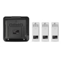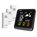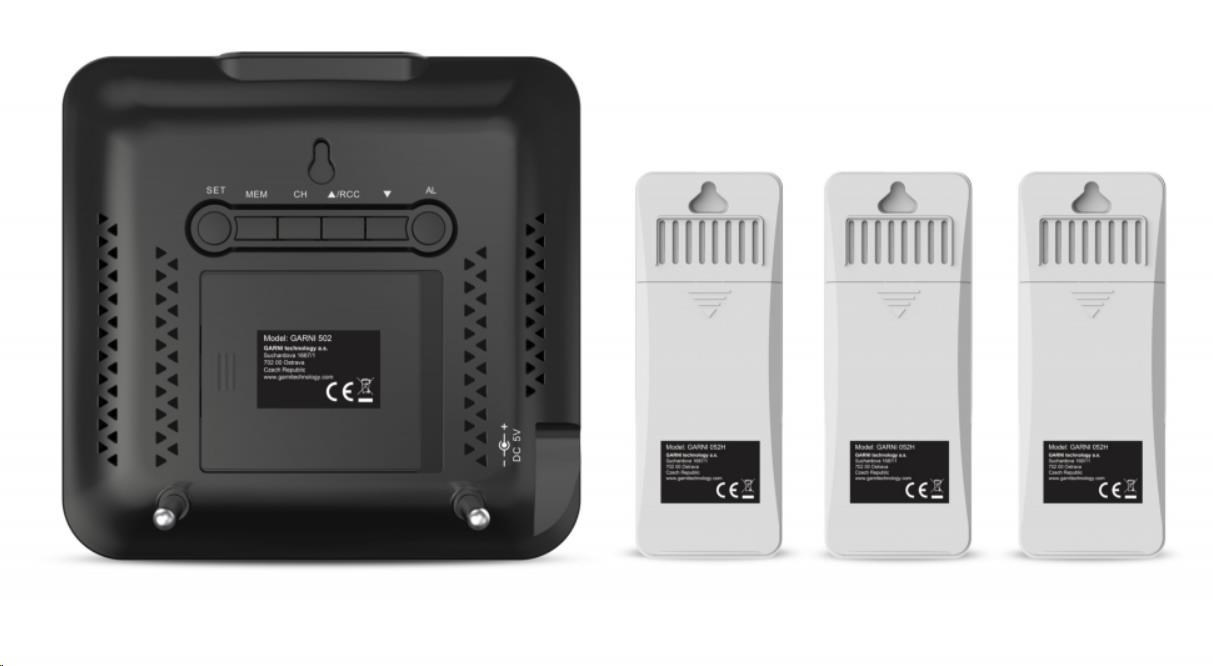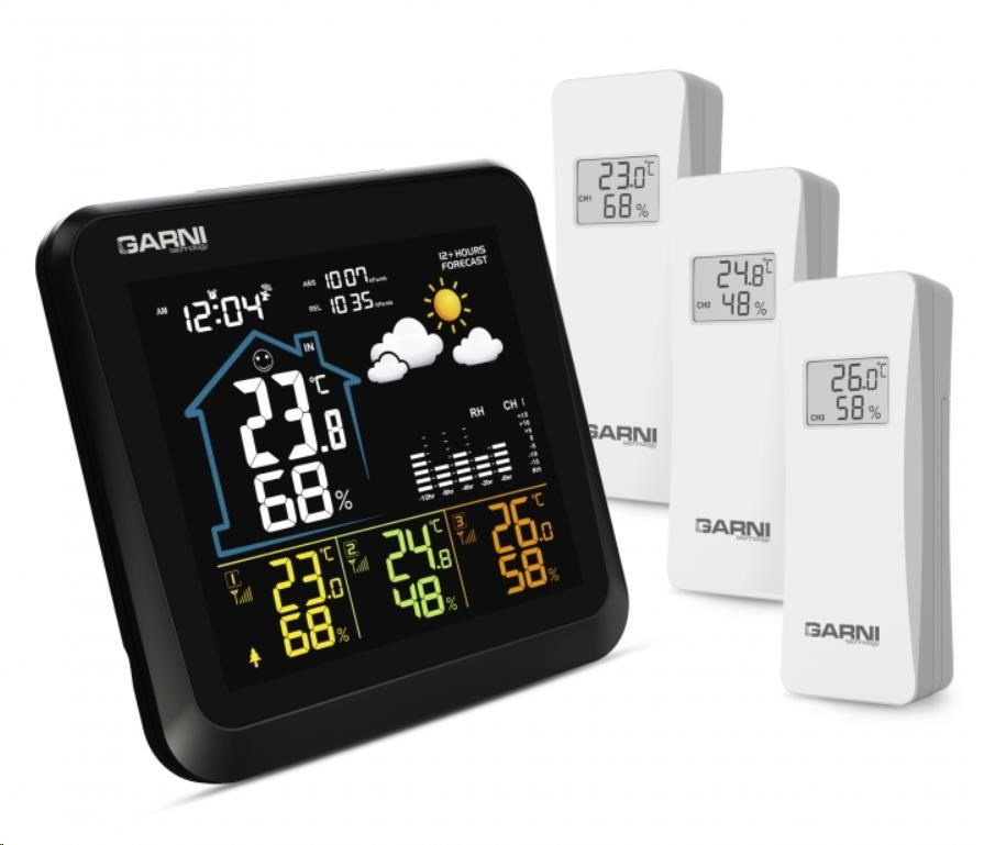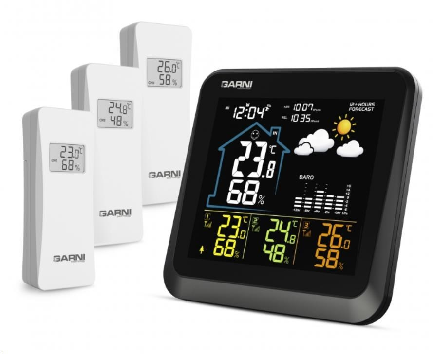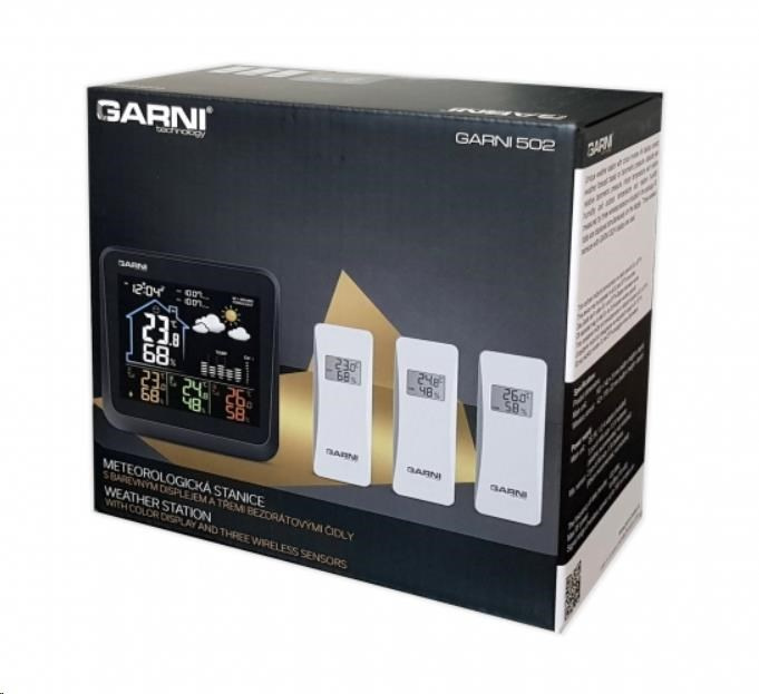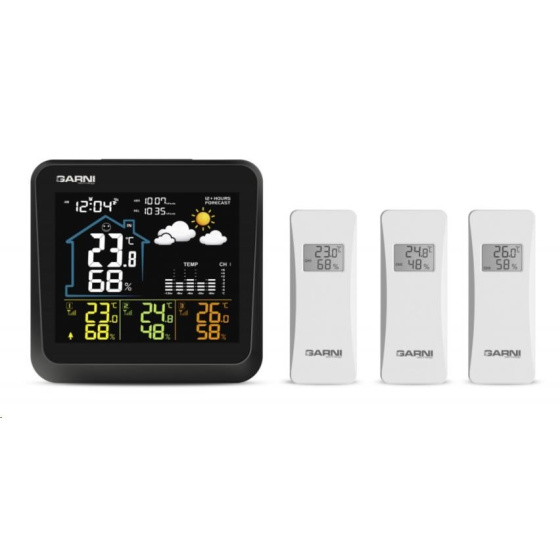 Meteorologická stanica s 3 bezdrôtovými snímačmi na meranie vonkajšej teploty a relatívnej vlhkosti, špičkovým inverzným farebným VA displejom s časom a dátumom riadeným rádiovým signálom DCF-77, budíkom, grafom, meraním vnútornej teploty, relatívnej vlhkosti a absolútneho a relatívneho barometrického tlaku. Zobrazenie všetkých meraných hodnôt na displeji súčasne. špičkový inverzný farebný VA displej o rozmeroch 106 x 94 mm s možnosťou stályho osvetlenia pri napájaní sieťovým adaptér, alebo krátkodobým osvetlením na 10 s pri napájaní batériami tri stupne jasu osvetlenia displeja (pri napájaní sieťovým adaptér) a možnosť vypnutia osvetlenia displeja veľkosť číslic na displeji – čas, dátum 7 mm, vnútorná teplota 21 mm, vnútorná relatívna vlhkosť 14 mm, vonkajšia teplota 12,5 mm, vonkajšia relatívna vlhkosť 10 mm, barometrický tlak 4,5 mm farbenie na displeji: čas, barometrický tlak, vnútorná teplota a rel. vlhkosť, graf biela, teplota a rel. vlhkosť na kanáli č.1 žltá, na kanáli č.2 zelená a na kanáli č.3 oranžová čas a dátum riadené signálom DCF-77 s možnosťou manuálneho nastavenia ikona príjmu signálu DCF-77 12-hodinový alebo 24-hodinový formát zobrazenia času možnosť nastavenia časového pásma od -12 do +12 hodín budík s funkciou opakovaného budenia (Snooze) po 5 minútach budící signál - 10 sekúnd 1 pípnutie za sekundu, 10 sekúnd 2 pípnutia za sekundu, 10 sekúnd 4 pípnutia za sekundu a následne stály pípajúci zvuk 5 ikon predpovede počasia (jasno, polojasno, oblačno, zrážky (dážď), zrážky (sneženie) na základe sledovania barometrického tlaku vestaveným barometrom možnosť nastavenia východiskovej ikony predpovede počasia zobrazenie hodnôt vnútorného a vonkajšieho tepla a relatívnej vlhkosti zo všetkých 3 snímačov súčasne zobrazenie teploty vo °C alebo °F zobrazenie barometrického tlaku absolutného a relatívneho (hPa/mb alebo mmHg) možnosť nastavenia hodnoty relatívneho barometrického tlaku graf vývoja bar. tlaku, vnútorné a vonkajšie teploty na všetkých troch kanáloch za uplynulých 12 hodín pamäť na maximálne a minimálne namerané hodnoty teploty a relatívnej vlhkosti 3 ikony vnútorného tepelného pohodlia 3 bezdrôtové snímače GARNI 052H sú súčasťou balenia bezdrôtový prenos hodnôt vonkajšej teploty a relatívnej vlhkosti na frekvencii 433 MHz ikona slabých batérií hlavnej jednotky a vonkajších snímačov napájanie hlavnej jednotky sieťovým adaptérom alebo batériami dĺžka kábla sieťového adaptéra 1,80 m možnosť postaviť, alebo zavesiť farba čierna Bezdrôtové snímač GARNI 052H odolné voči vlhkosti displej o rozmeroch 25 x 12 mm veľkosť číslic na displeji: teplota 7 mm a relatívna vlhkosť 6 mm meranie teploty a relatívnej vlhkosti 3 kanály maximálny RF výkon 10 dBm (10 mW) možnosť postaviť, alebo zavesiť farba biela Obsah balenia: 1 x hlavná jednotka GARNI 502 3 x bezdrôtové snímače GARNI 052H 1 x sieťový adaptér český, slovenský, nemecký, anglický, poľský, maďarský a holandský návod