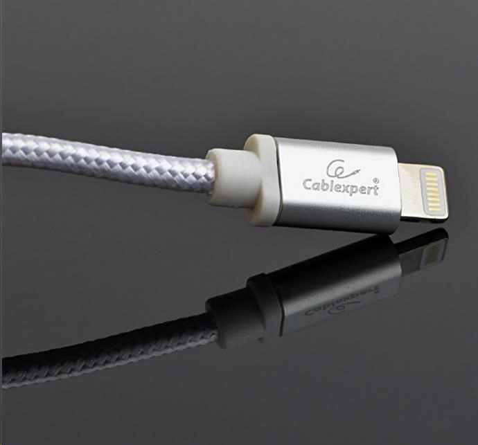 Bavlnený opletený 8-pinový kábel s kovovými konektormi, 1.8 m, strieborná farba, blister
