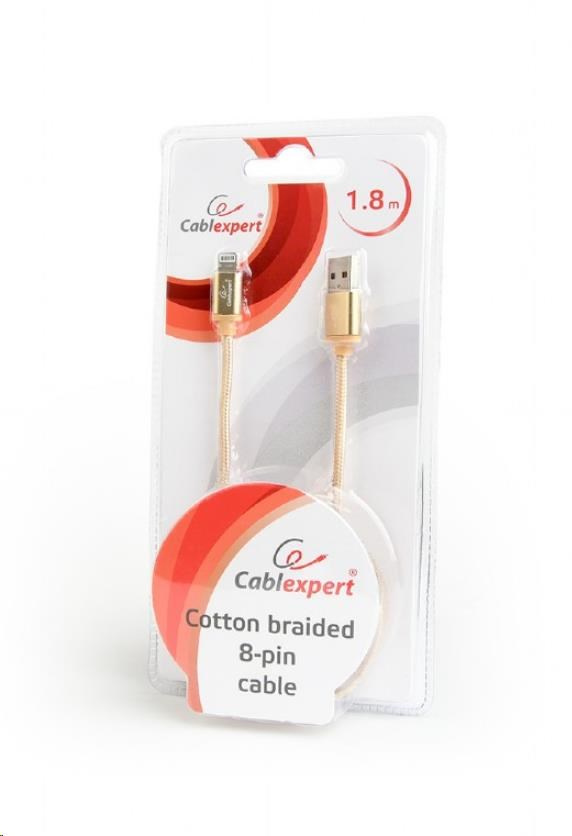 Bavlnený opletený 8-pinový kábel s kovovými konektormi, 1.8 m, zlatá farba, blister