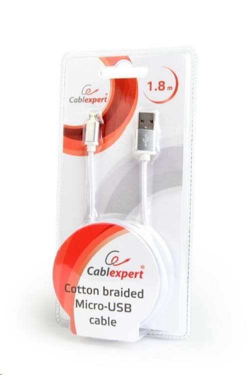 Bavlnený opletený kábel Micro-USB s kovovými konektormi, 1.8 m, strieborná farba, blister