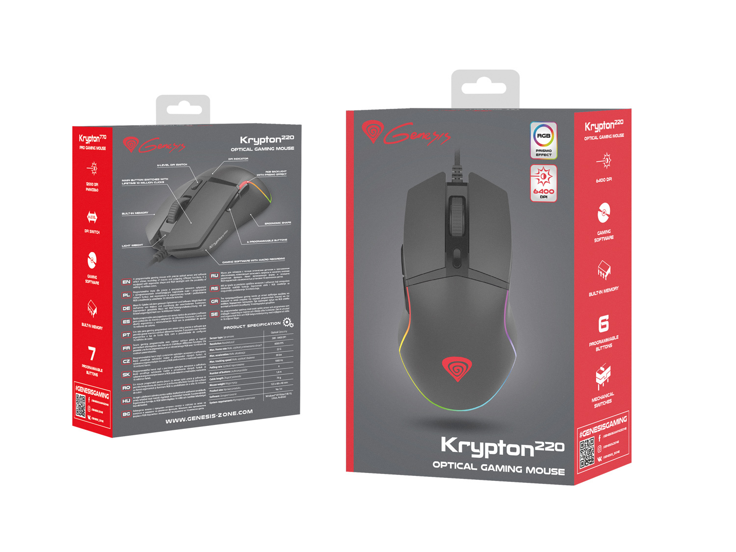 Genesis herná optická myš KRYPTON 220/RGB/6400 DPI/Herná/Optická/6 000 DPI/Drôtová USB/Čierna