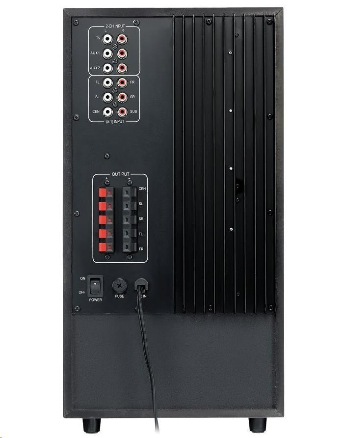 Reproduktorový systém v konfigurácii 5.1 ponúka celkový výkon 200 W. Zostava s drevenou povrchovou úpravou sa skladá z kvalitného subwoofera s 8" reproduktorom, ktorý má integrovaný zosilňovač a výkon 75 W. Subwoofer dopĺňajú štyri satelity a jeden stredový reproduktor s výkonom 4 x 24 W + 1 x 30 W. Balenie obsahuje napájací adaptér 100-240 V a diaľkové ovládanie.
