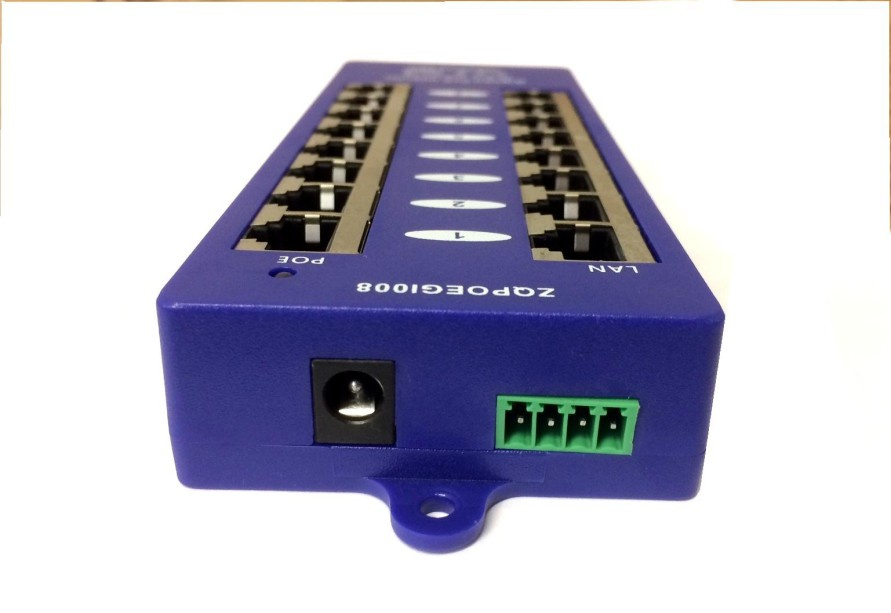 Rozhraní: 8x stíněný RJ45 konektor pro připojení do LAN (Data) 8x stíněný RJ45 konektor pro sloučený výstup (Data+Napájení) LED signalizace: Power OFF -- bez signalizace 4/5 (V+),7/8 (V-) -- zelená 4/5 (V-),7/8 (V+) -- červená