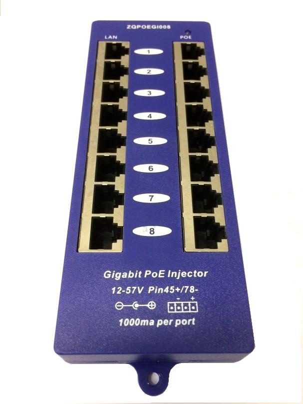 Panel integrující osm gigabitových pasivních POE injektorů s napájecím rozsahem 12-57V a max. proudem 1000mA/port.