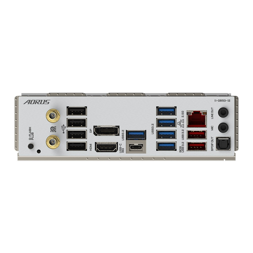 Porty na zadním panelu: * 1x tlačítko Q-Flash Plus * 2x anténní konektor SMA (2T2R) * 1x DisplayPort * 1x HDMI * 1x USB typ-C®, s podporou USB 3.2 Gen 2 * 2x USB 3.2 Gen 2 typ-A (červený) * 5x USB 3.2 Gen 1 * 4x USB 2.0/1.1 * 1x RJ-45 * 1x optický konektor S/PDIF Out * 2x audio jack