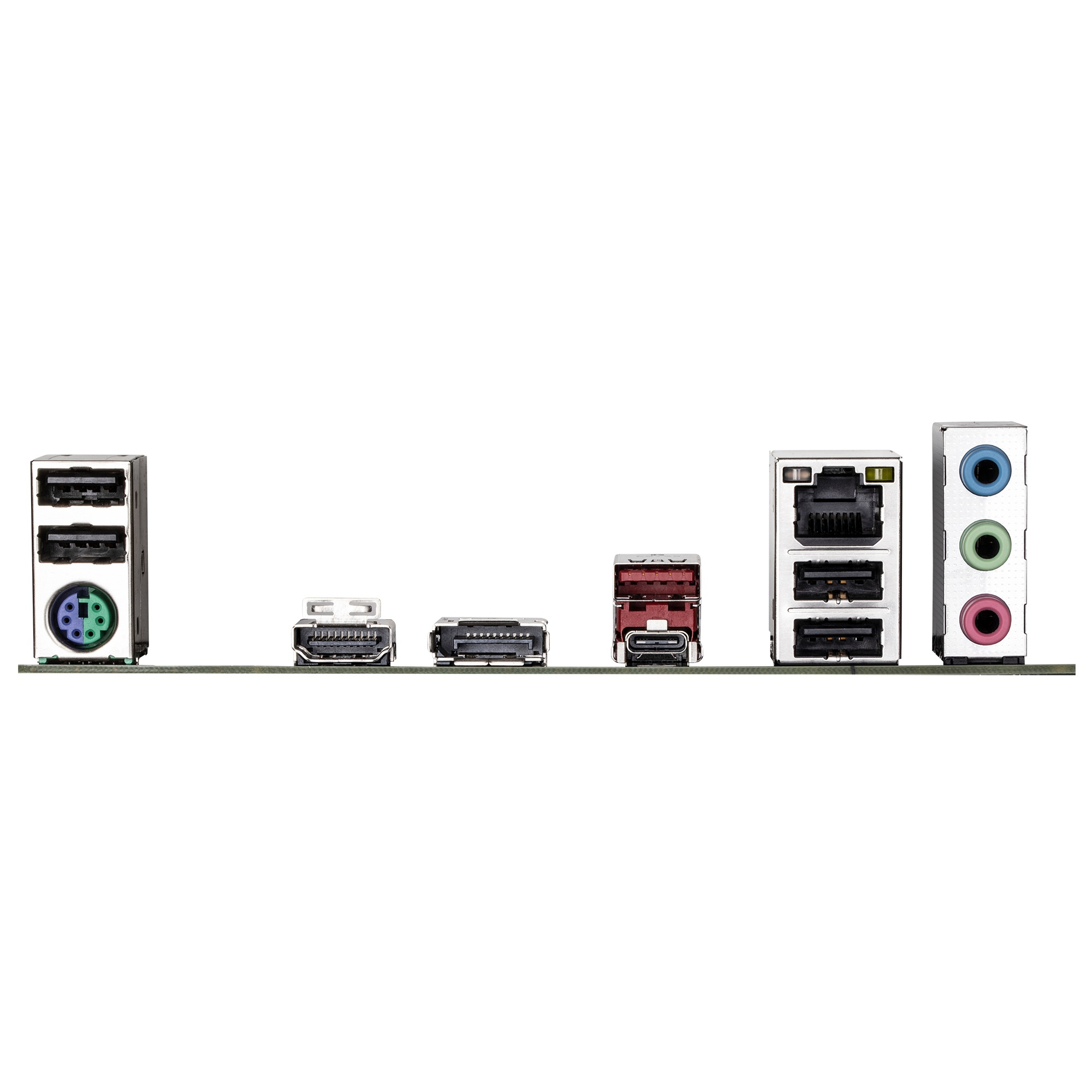 Porty na zadním panelu: * 1x PS/2 * 1x USB Type-C® 3.2 Gen 2x2 * 1x USB 3.2 Gen 2 Type-A (červený) * 4x USB 2.0/1.1 * 1x HDMI * 1x DisplayPort * 1x RJ-45 * 3x audio konektory